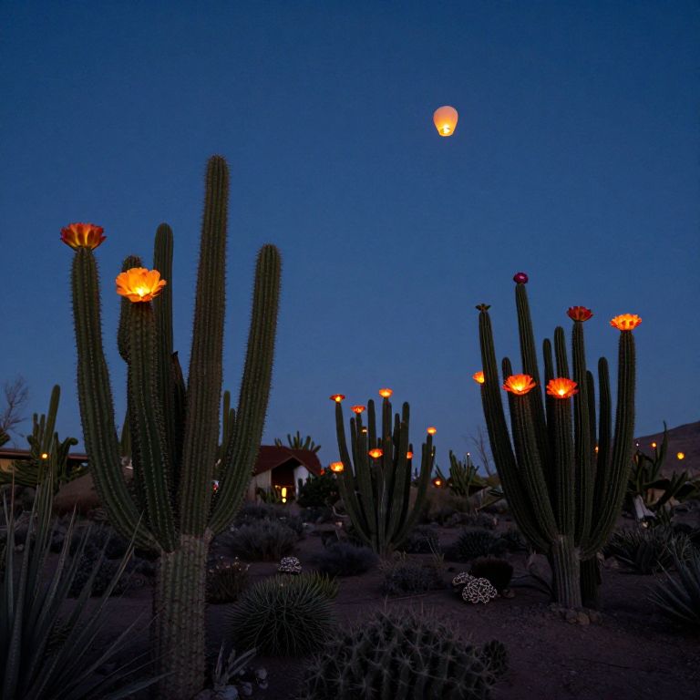 Photograph of a twilight desert landscape featuring tall, columnar cactus plants illuminated by glowing, orange lantern-like lights at their tips. The sky is a deep blue, transitioning to night. Small buildings with lit windows are visible in the background, partially obscured by the cacti. The ground is sandy with scattered desert vegetation. The lighting creates a striking contrast between the dark silhouettes of the cacti and the warm, glowing lights. The overall scene is serene yet otherworldly.