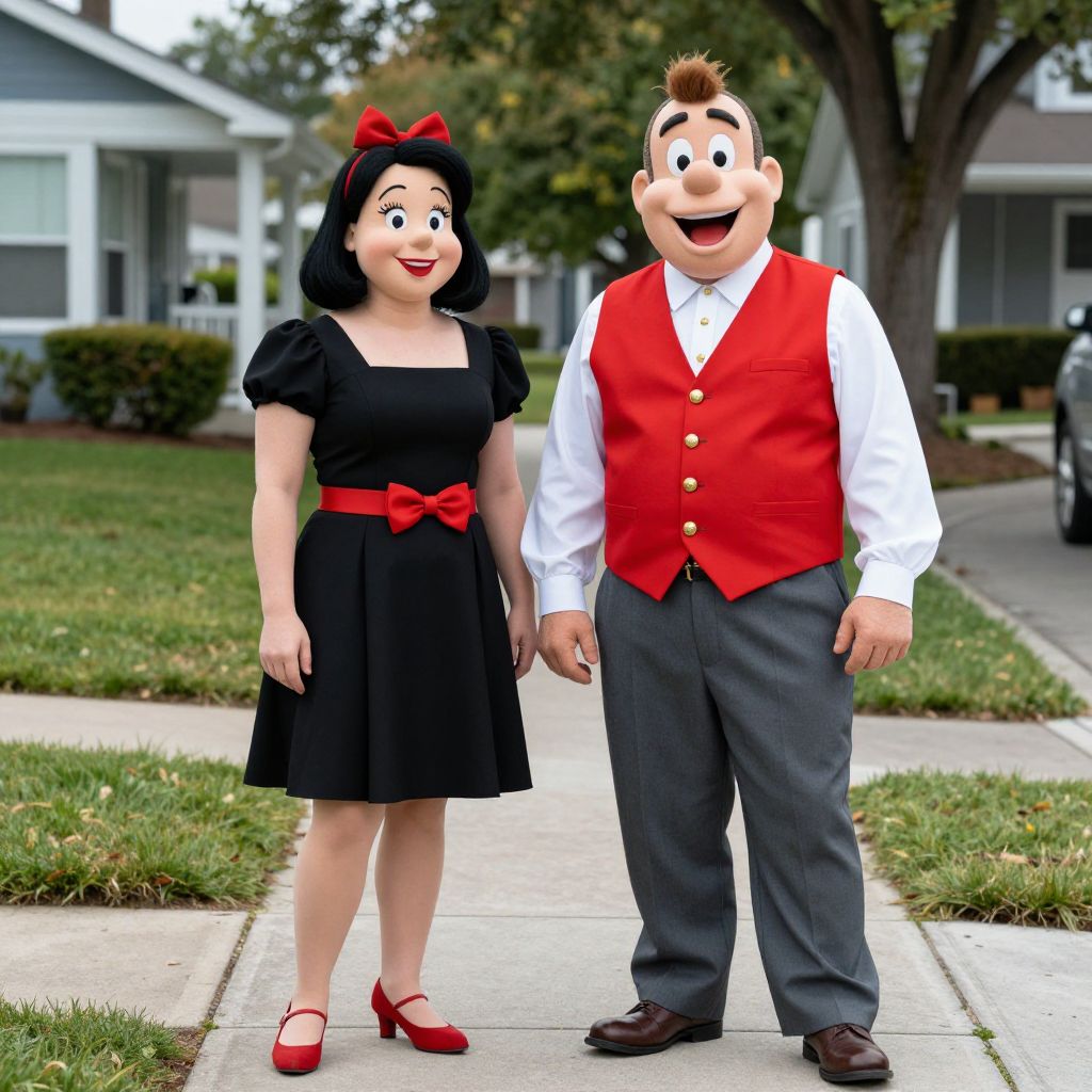 Two individuals dressed as iconic cartoon characters stand side by side on a suburban sidewalk, with the woman wearing a black dress accented by a red belt and bow, and the man sporting a red vest over a white shirt with gold buttons, paired with gray trousers and brown shoes.