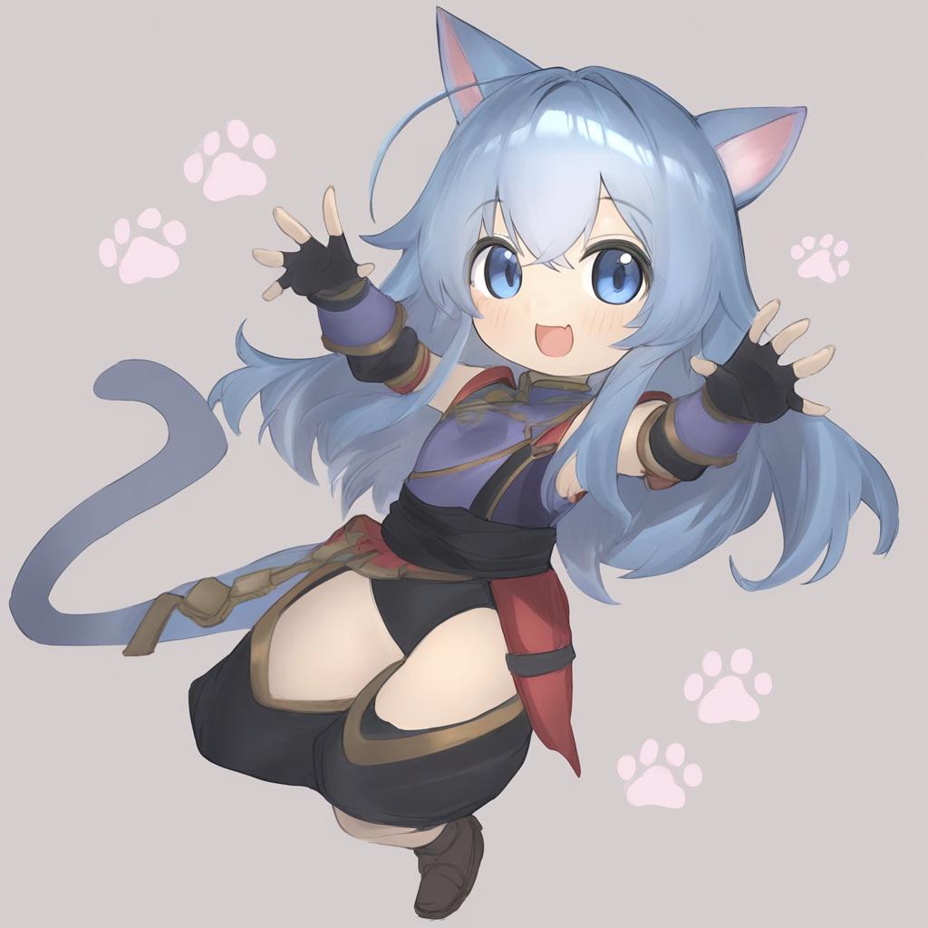 Monk (final fantasy), final fantasy, 1girl, cat ears, cat tail, blue eyes, short hair, long hair, fingerless gloves, miqo'te, by artist ranf, leet