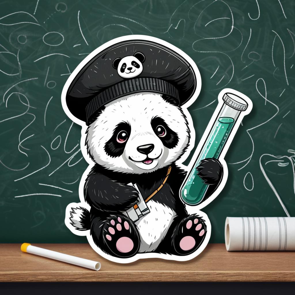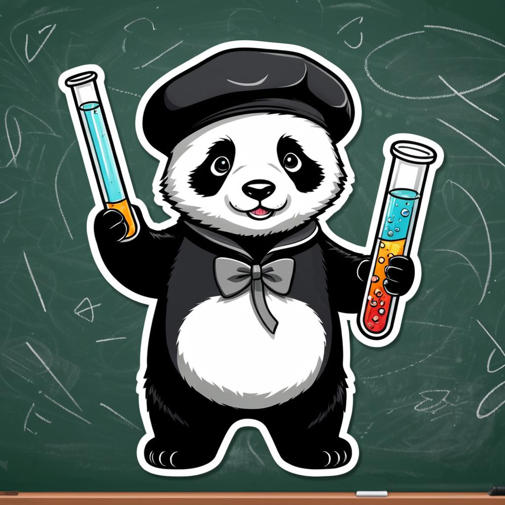 Panda in a beret holding a test tube, Kawaii Style, die cut sticker, no text, 2d art style sticker, vector style, clean lines on a chalkboard background only, chalkboard background