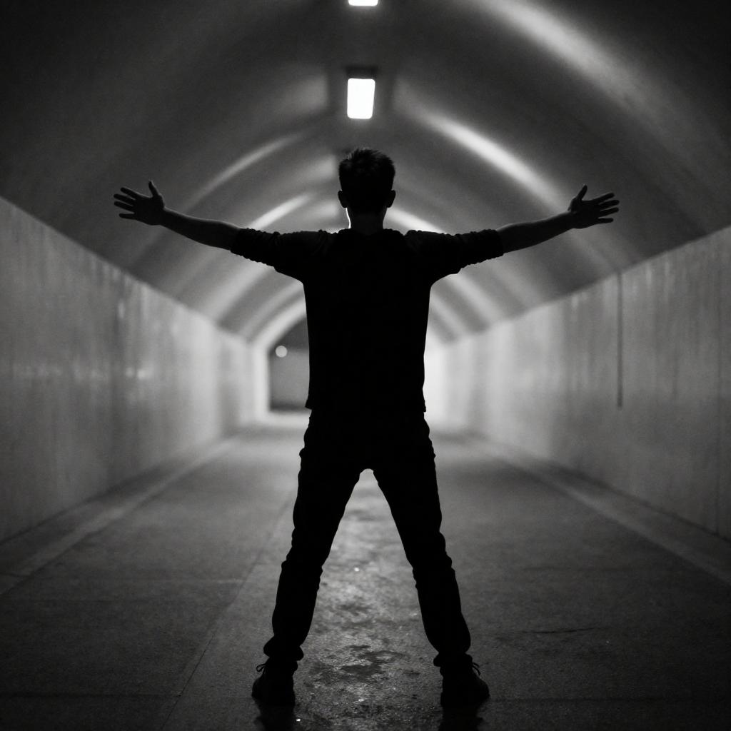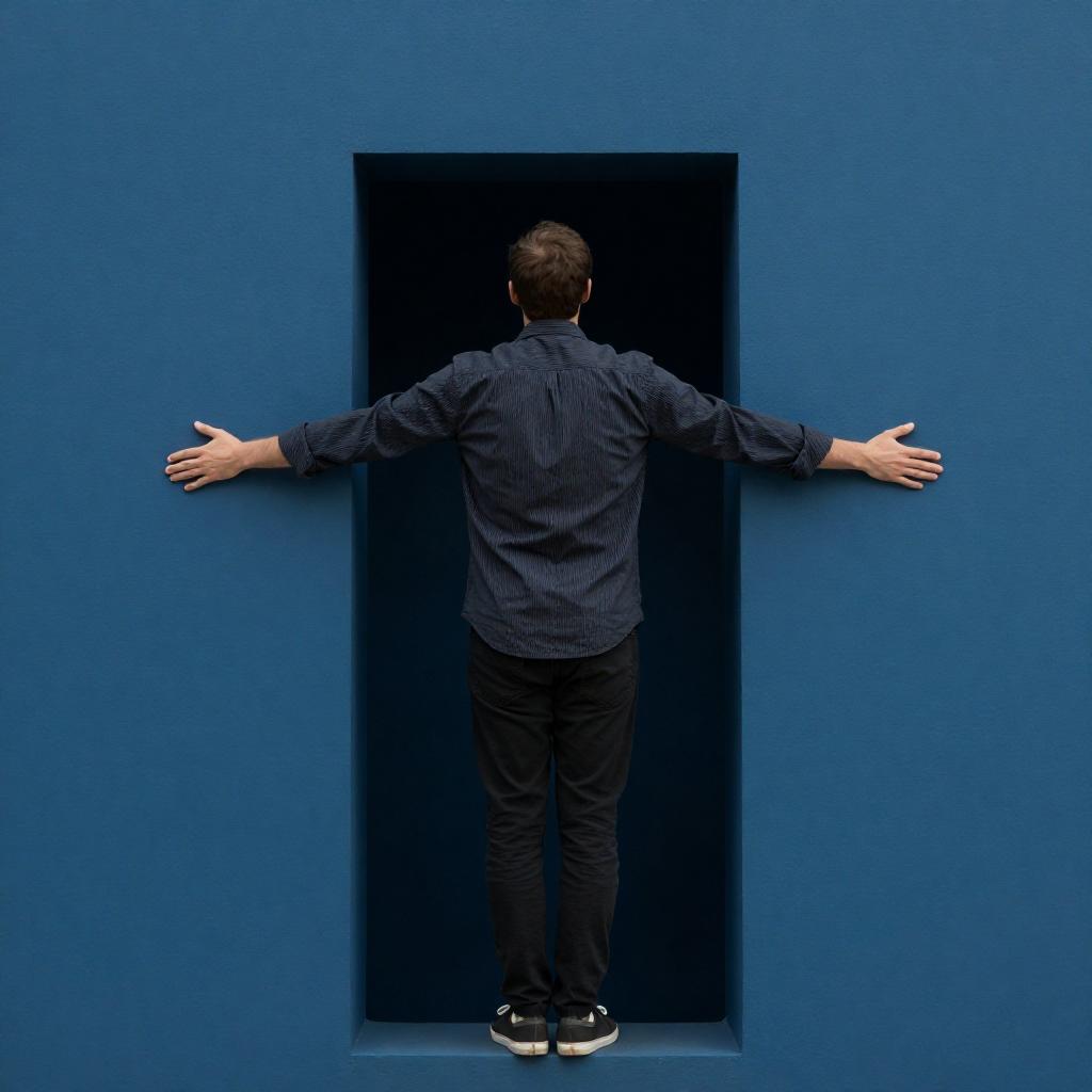 Man with short brown hair, wearing dark striped shirt and black pants, stands with arms outstretched on blue platform, facing dark rectangular doorway, smiling. Minimalist blue background. Photographic image.