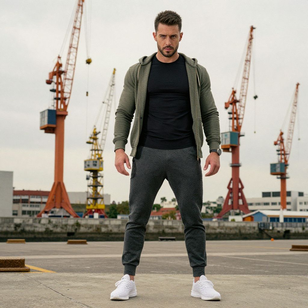 A man, slim-fit joggers in charcoal, black moisture-wicking tech t-shirt, olive green lightweight zip-up hoodie, white breathable mesh sneakers, standing on concrete docks, towering cranes in the background, technicolor analog film stock, focused expression, ready for action. Man has masculine face and piercing eyes