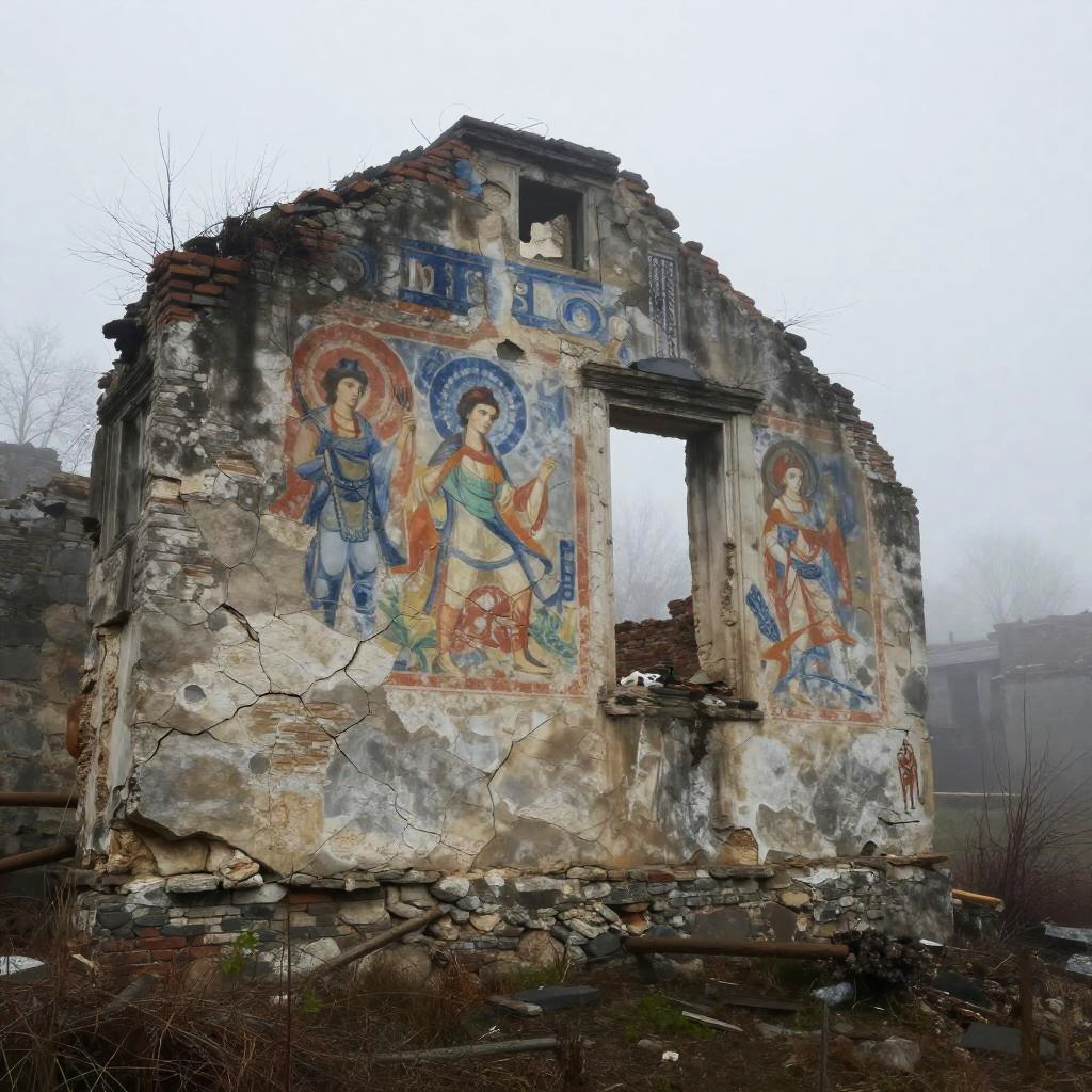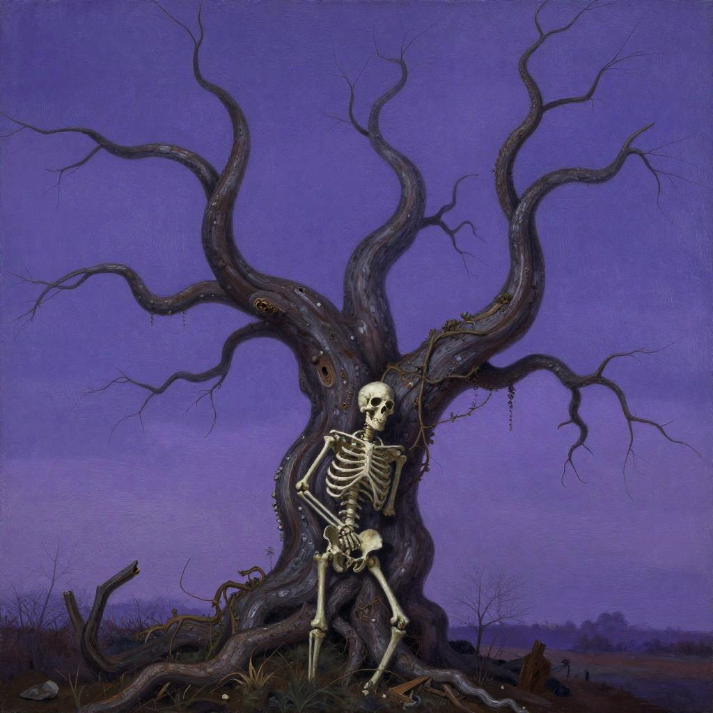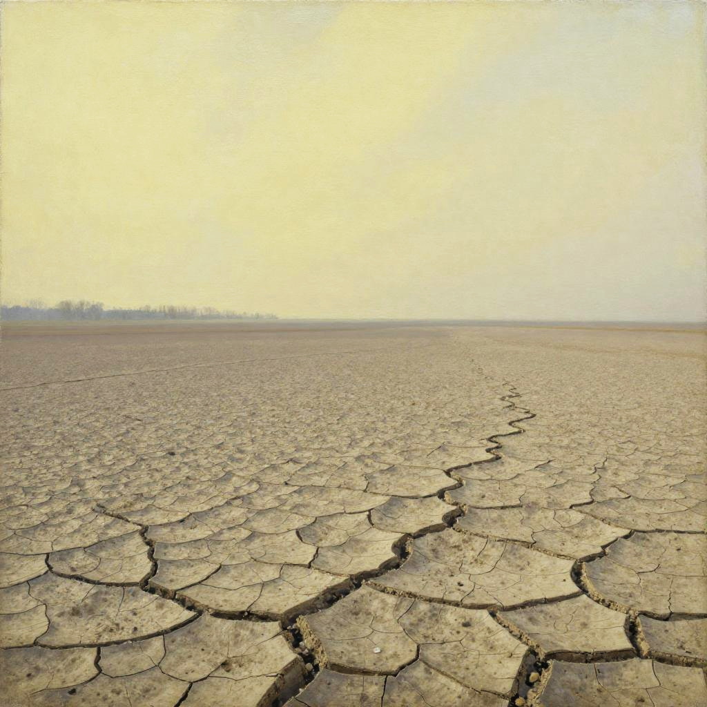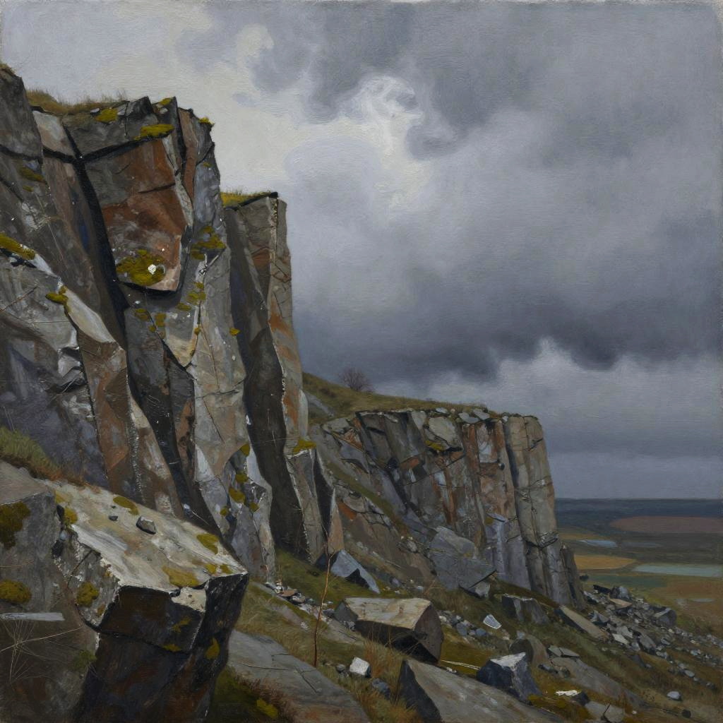 Painting of rugged, gray cliffs under a stormy, cloudy sky with patches of yellow grass and distant, flat landscape. Dramatic, moody