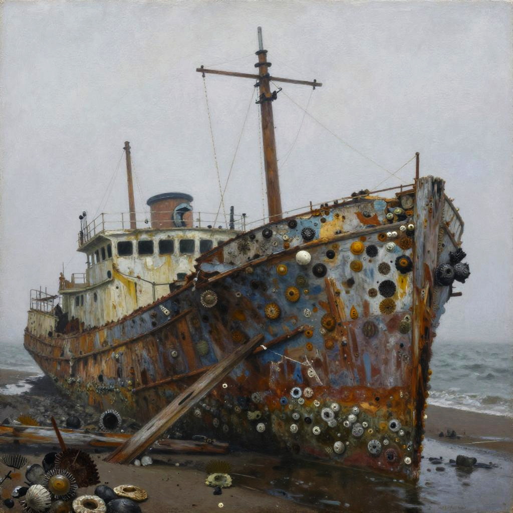 Painting of a windswept cliffside with a turbulent gray sky, in the style of Anselm Kiefer, featuring jagged rocks with moss patches.