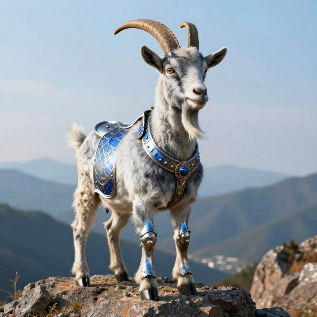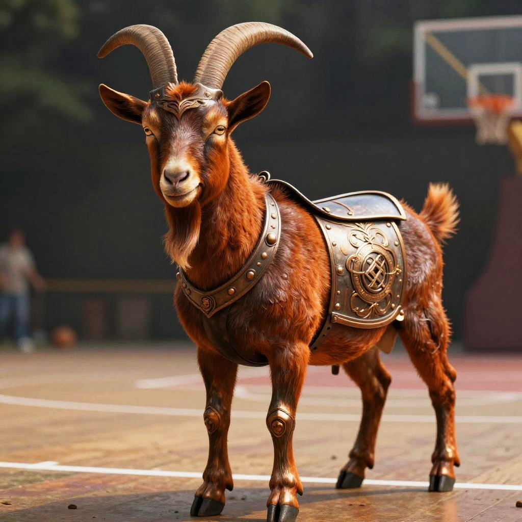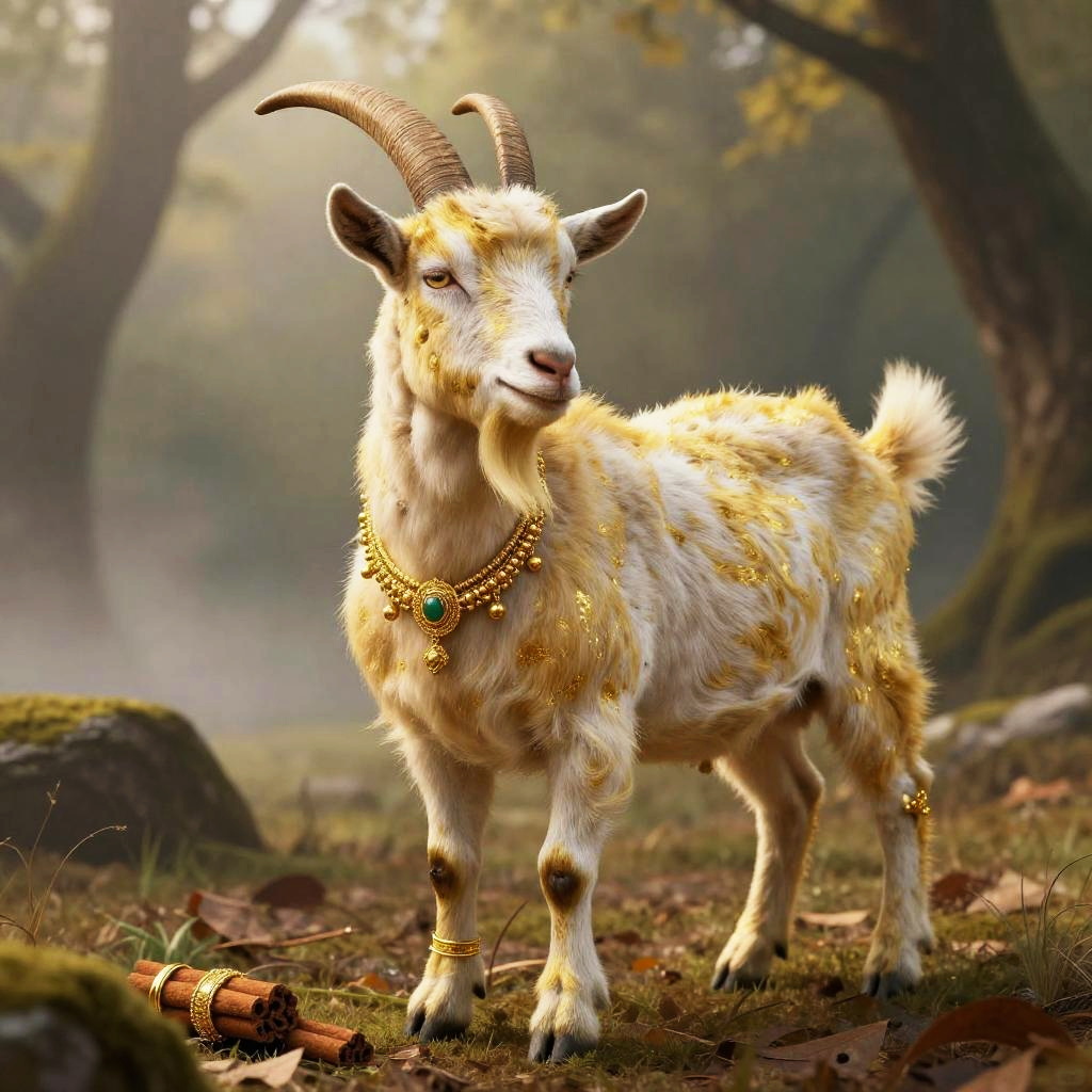 Apple Cinnamon A goat with glowing ember eyes, wearing a flaming feathered cape, standing on a volcanic lava field. The scene is regal, emphasizing fiery red and dark charcoal, hyper-detailed, beautifully color-coded, insane details, Unreal Engine, Cinematic Lighting.