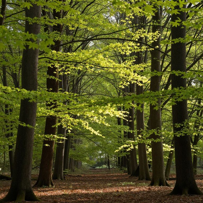 Photograph of a dense forest with tall, straight trees having dark brown trunks. The trees are adorned with bright green, sunlight-lit leaves creating a vibrant canopy. The forest floor is covered in a layer of brown, fallen leaves. Sunlight filters through the leaves, casting dappled light and shadows. The background shows a narrow, tree-lined pathway extending into the distance. The overall atmosphere is serene and lush, with a strong contrast between the dark trunks and the bright green foliage.
