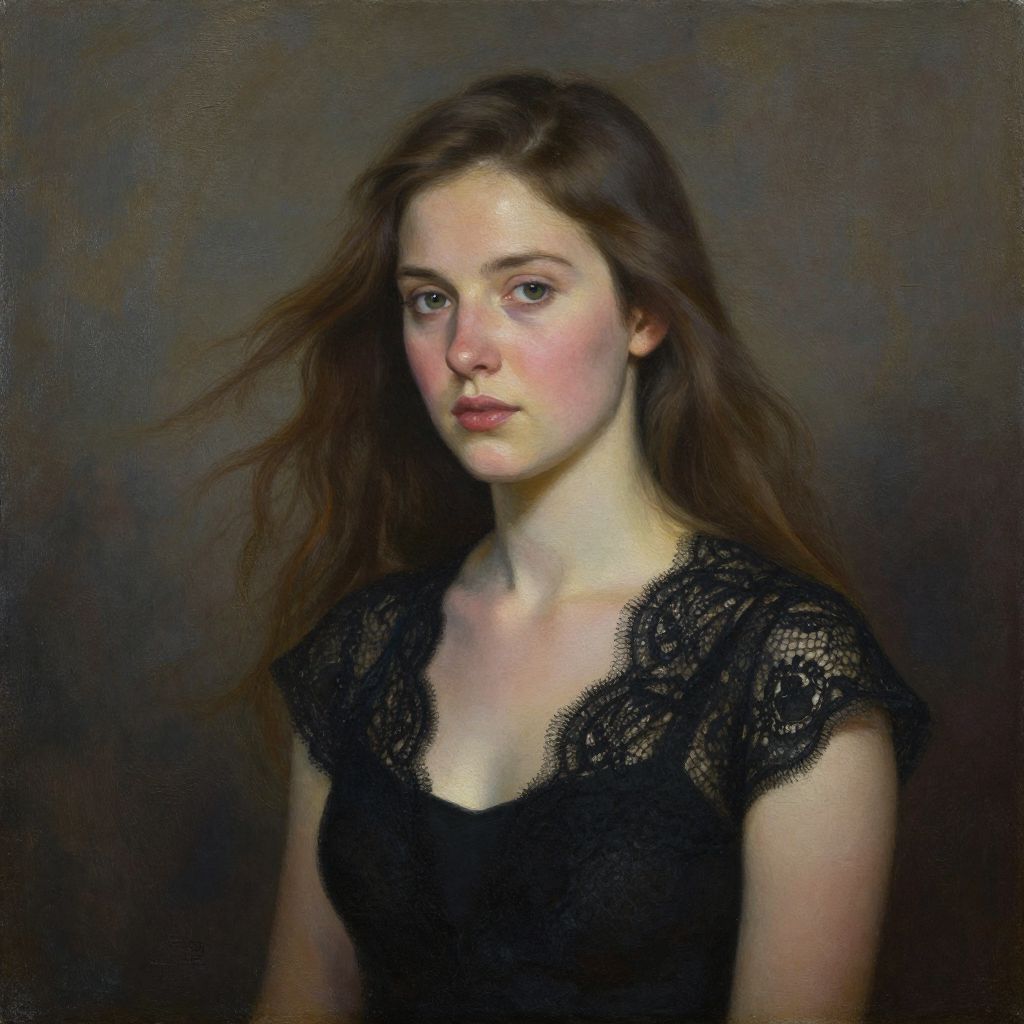 Photorealistic digital painting of a young woman with fair skin and long, wavy brown hair. She wears a black lace dress with a low neckline, revealing a hint of cleavage. Her expression is pensive, with slightly parted lips and soft, pinkish blush on her cheeks. The dark, muted background contrasts with her illuminated face and upper body, highlighting her delicate features. Her hair is gently blown to the side, adding a dynamic feel to the otherwise still portrait. The texture of the lace and the soft shading create a realistic, almost three-dimensional effect.