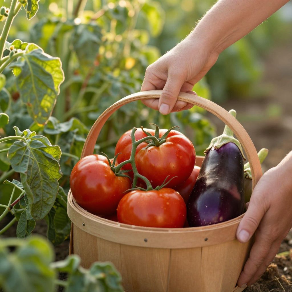 Woman harvesting fresh produce, placing vibrant tomatoes and an eggplant into a wooden basket surrounded by lush green foliage under a warm, golden light.
