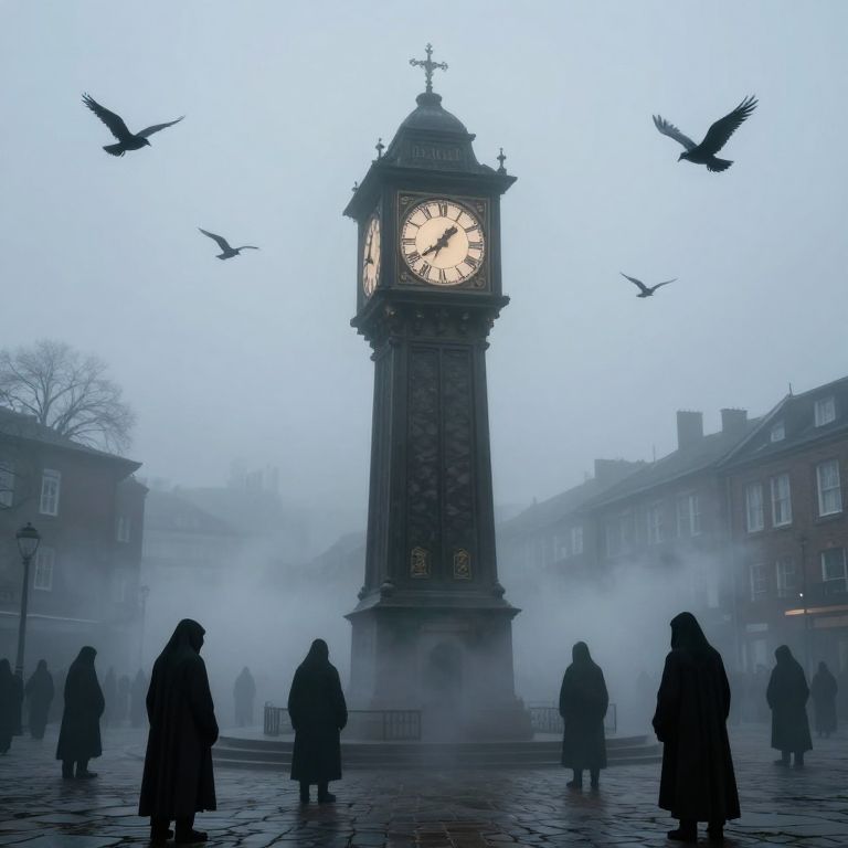 A spectral clocktower looms over a foggy plaza, its base engulfed in swirling mist as cloaked figures gather, their forms shrouded in mystery beneath a sky filled with ominous birds, defying the ordinary passage of time.
