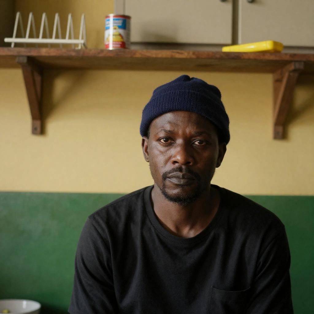 Close-up of a middle-aged Black man with a dark beard wearing a red and yellow knitted beanie and a black jacket. The man looks downward with a neutral expression. The background is blurred with indistinct figures, creating a focused upper body portrait.
