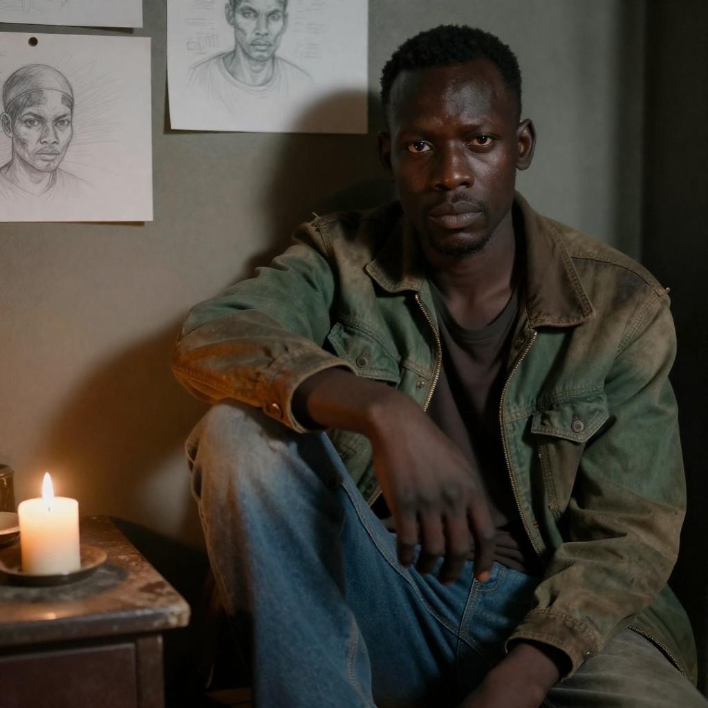 Photograph of a middle-aged Black man with a dark beard, wearing a red, yellow, and black knitted beanie, looking downward with a neutral expression. Blurred background with indistinct figures. Close-up, upper body shot.