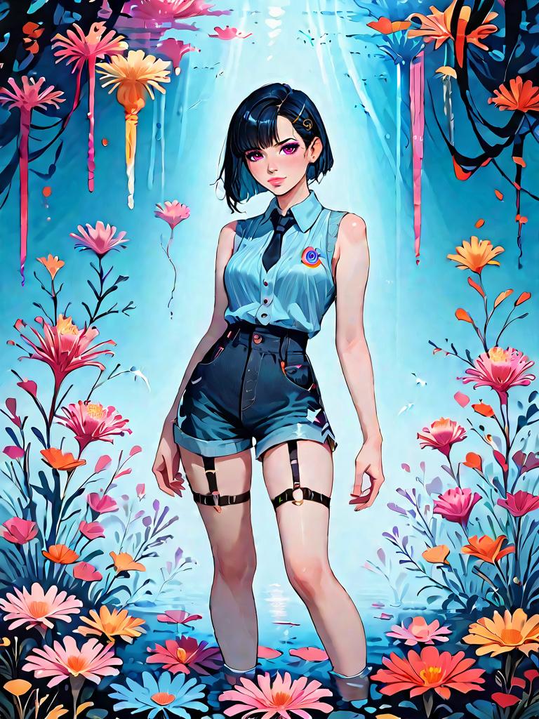 A digital illustration of a stylized anime girl standing amidst vibrant, surreal flowers in a dark fantasy nighttime setting with fog and mist. The girl has short black hair, purple eyes with pink eyeshadow, and wears a sleeveless, light blue collared shirt with a dark tie and high-waisted dark shorts featuring strap details. She is surrounded by colorful blooming flowers in shades of pink, orange, and purple with glowing light rays filtering through the misty scene.