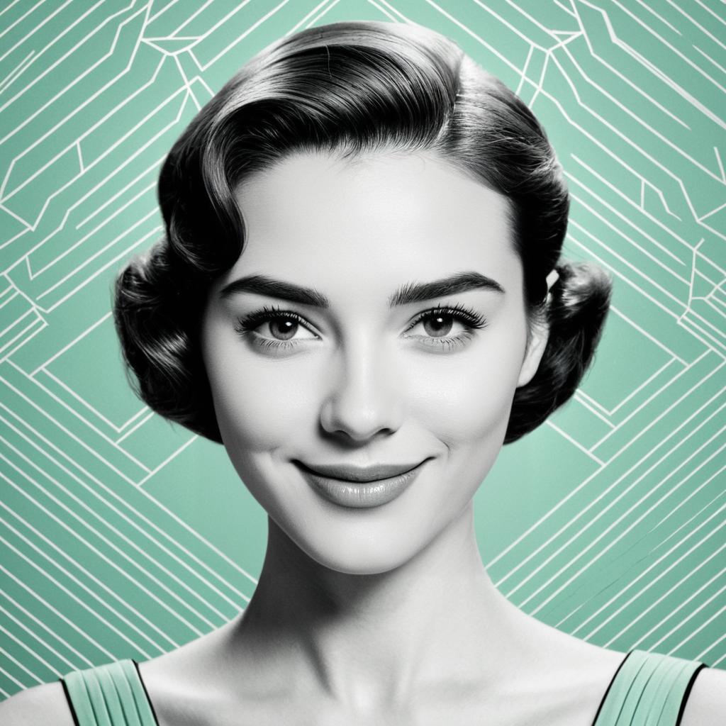 Minimalist portrait of elegant woman with closed eyes, outlined in pink and white tones, stylized eyelashes, geometric background with subtle circle patterns, art deco inspired, elegant and feminine aesthetic, soft lighting, high contrast, vintage illustration style.