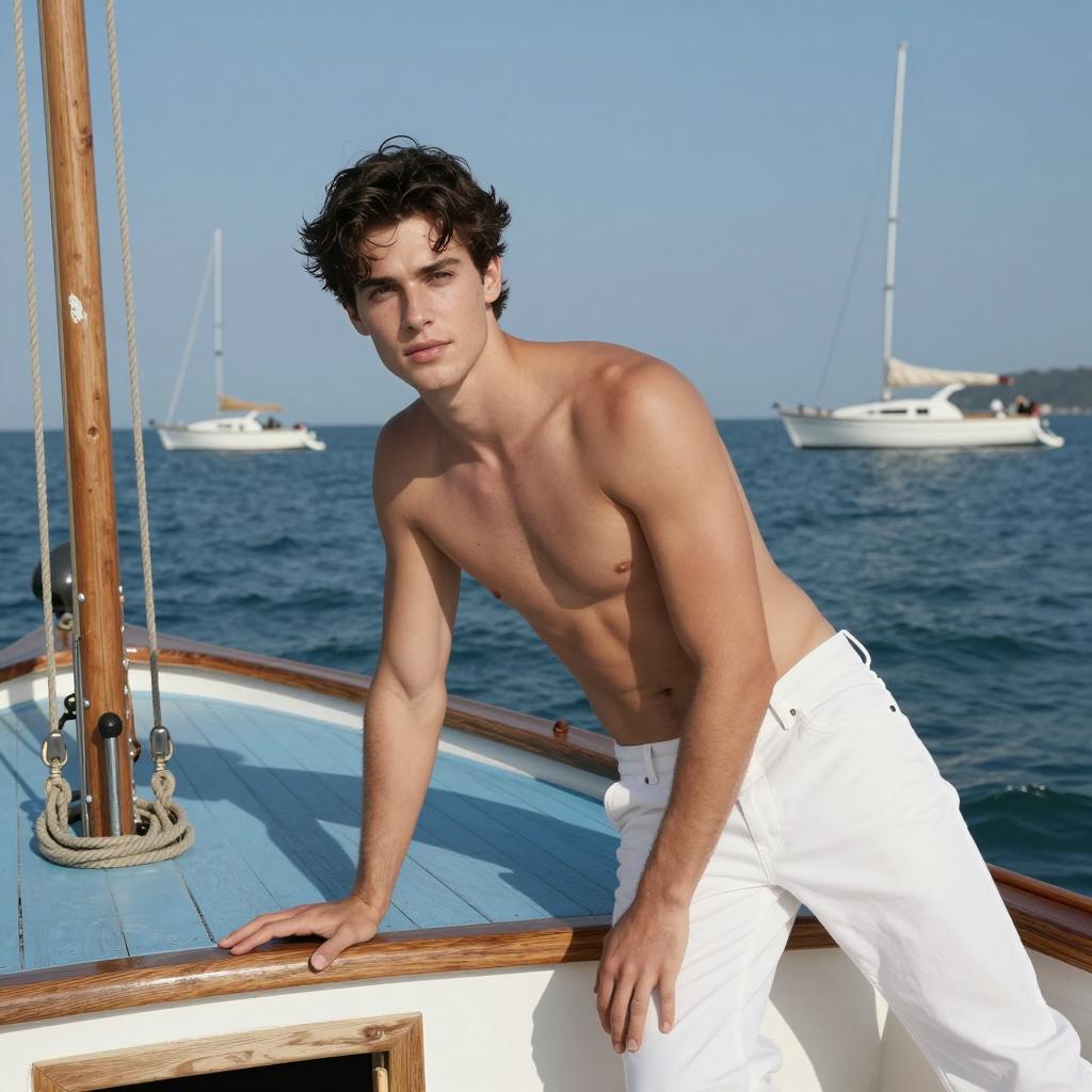 Young light-skinned man with dark curly hair, shirtless and wearing white pants, leaning forward on the deck of a wooden boat. The boat features blue and wooden surfaces, ropes, and a mast. He is outdoors on a sunny day with two white sailboats visible in the blue water background under a clear blue sky.