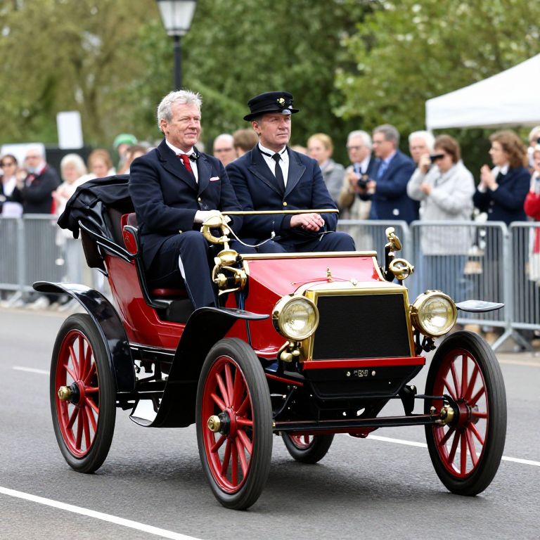 Vintage green convertible rolls gracefully along the route of the London to Brighton Veteran Car Rally 2012, showcasing its classic design with gold accents and a license plate reading \"FLOLI,\" as spectators gather behind to admire the historic display.