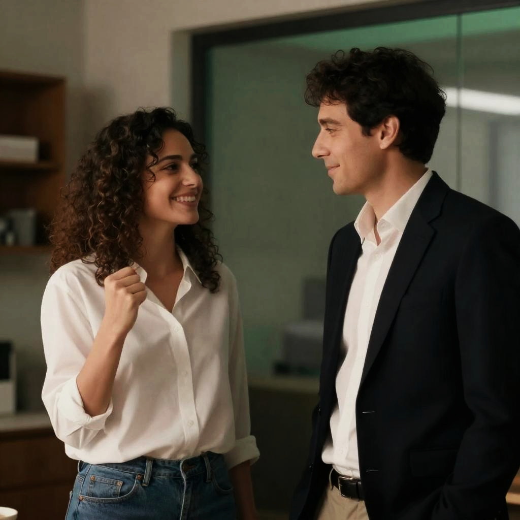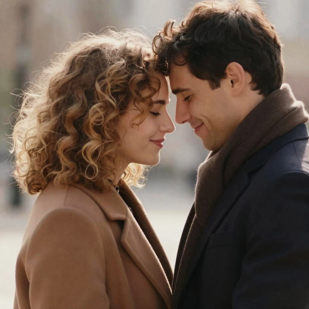 A man with dark hair wearing a brown jacket smiles as he reaches out to hand a bouquet of colorful flowers to a woman with curly brown hair dressed in a red and beige cloak. They stand on a stone balcony with carved stone railings and a classical statue in the background, sharing a joyful moment outdoors.