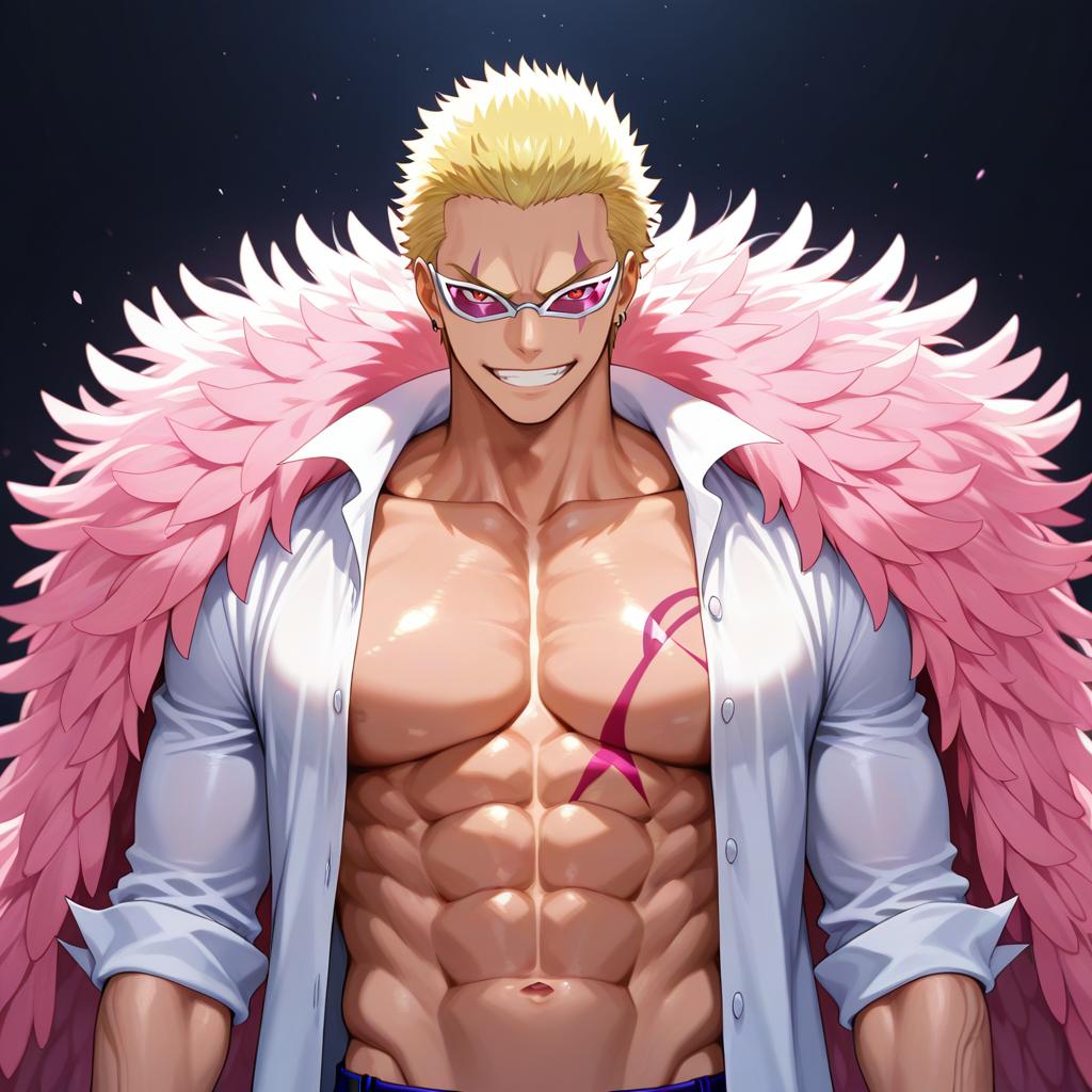 Digital artwork of Donquixote Doflamingo from One Piece featuring a muscular male character with short blonde hair, white-framed sunglasses, earrings, and a confident smile displaying teeth. He wears an open white shirt showcasing defined abs and a pink feather coat draped over his shoulders. The background is dark, highlighting the vibrant colors and intricate details of the character's design.