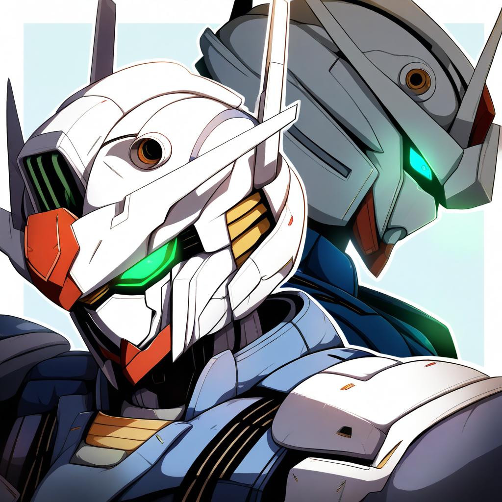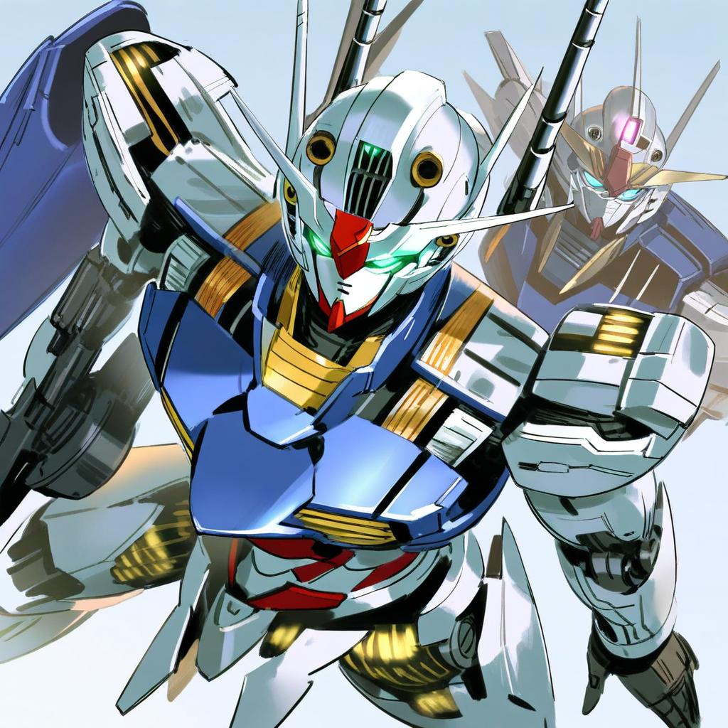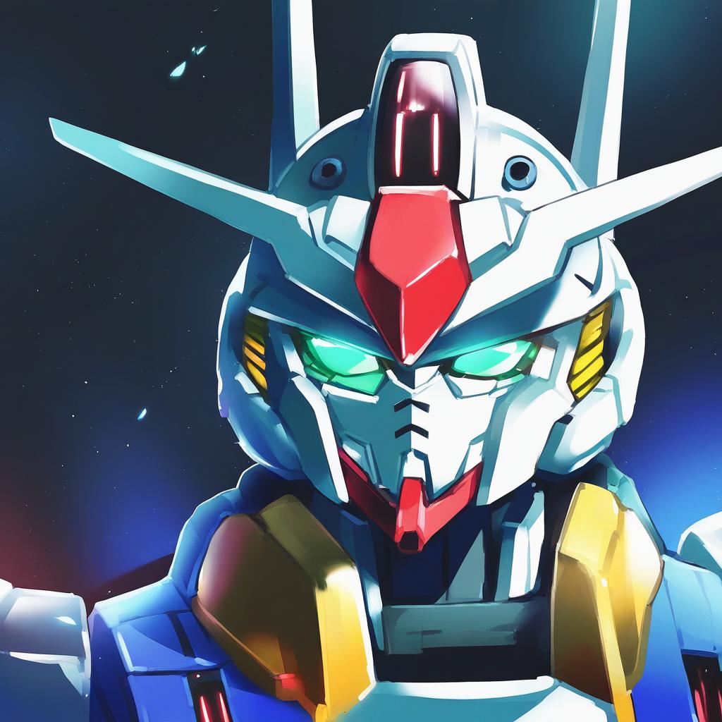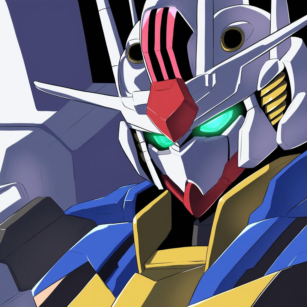 Illustration of Amuro Ray, a brown-haired, blue-eyed anime male character wearing a detailed pilot suit in blue, white, red, and yellow. Behind him stands a large white and red Gundam robot with yellow accents set against a clear blue sky. The anime style art is inspired by the Gundam series and artwork of artist Kinona.