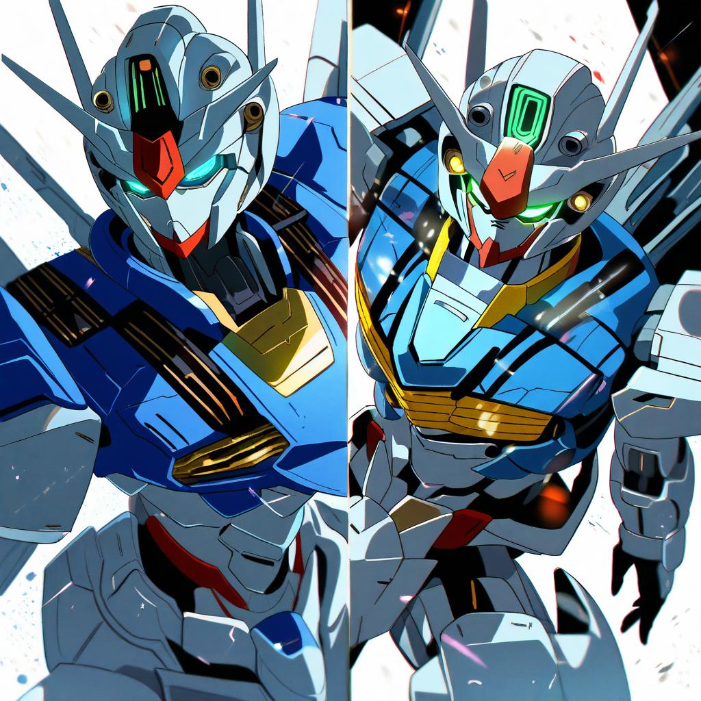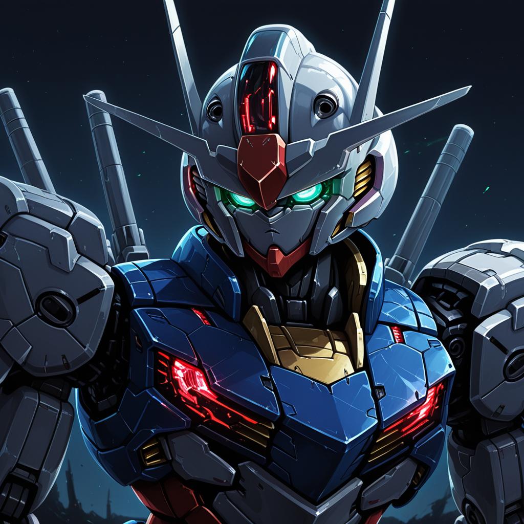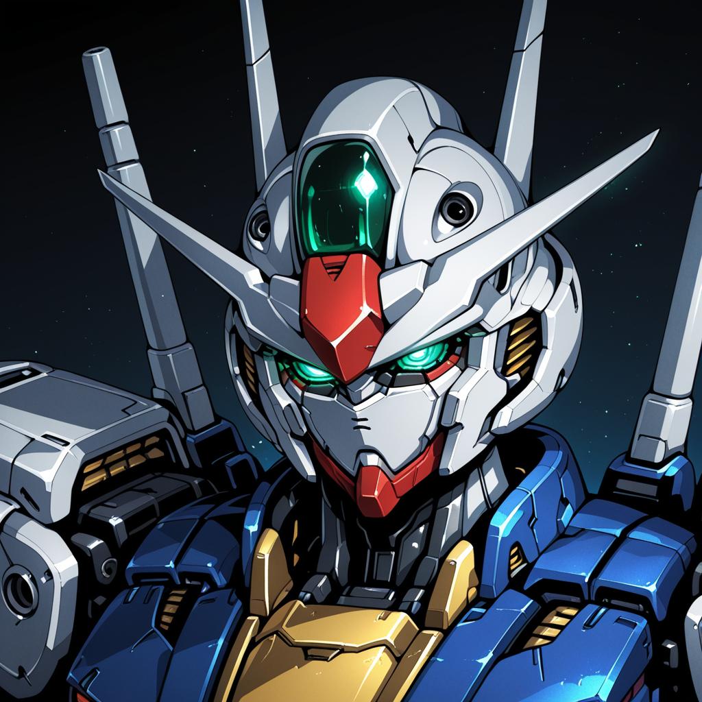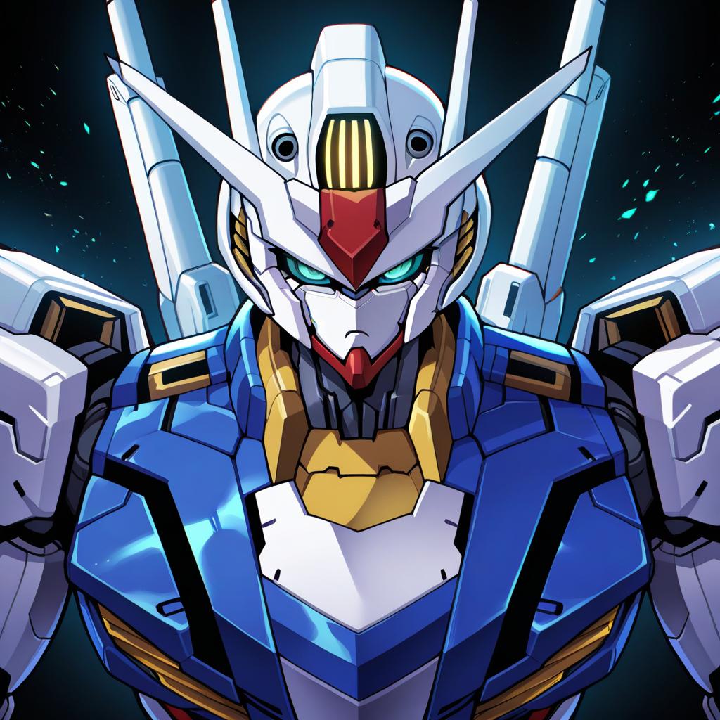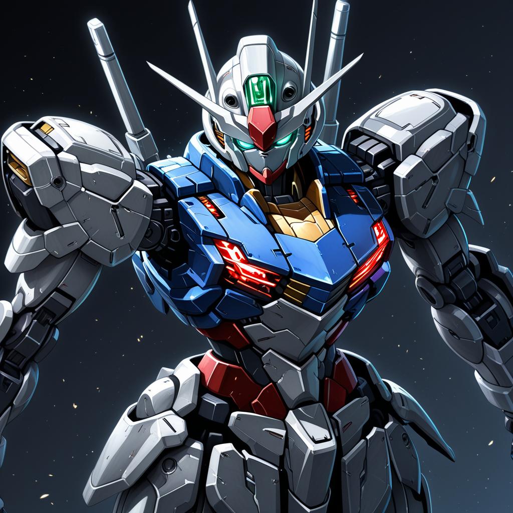 Illustration of Amuro Ray, a brown-haired, blue-eyed anime male character wearing a detailed pilot suit in blue, white, red, and yellow. Behind him stands a large white and red Gundam robot with yellow accents set against a clear blue sky. The anime style art is inspired by the Gundam series and artwork of artist Kinona.