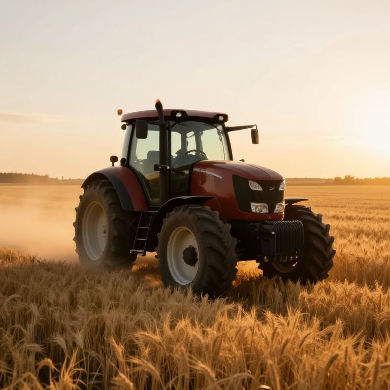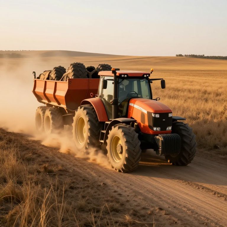 A large orange tractor hauling a heavy load across a dusty rural road, dust kicked into the air, wide open plains, golden hour lighting, dynamic angle, rugged terrain, highly detailed textures