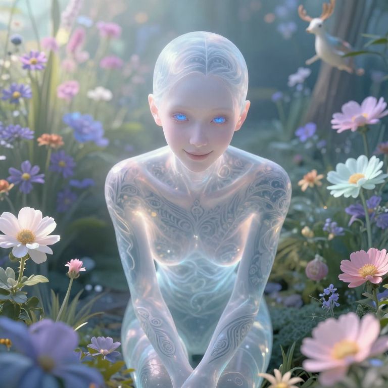 A digital CGI image of a translucent, ethereal, androgynous figure with glowing blue eyes, sitting in a lush, colorful garden. The figure has a smooth, featureless head and intricate, luminescent tattoos on their arms and chest. They are surrounded by vivid, blooming flowers in shades of pink, purple, and white, with sunlight filtering through the foliage. A small bird is perched on a branch in the background. The overall scene is serene and otherworldly, with a soft, dreamy light illuminating the entire composition.