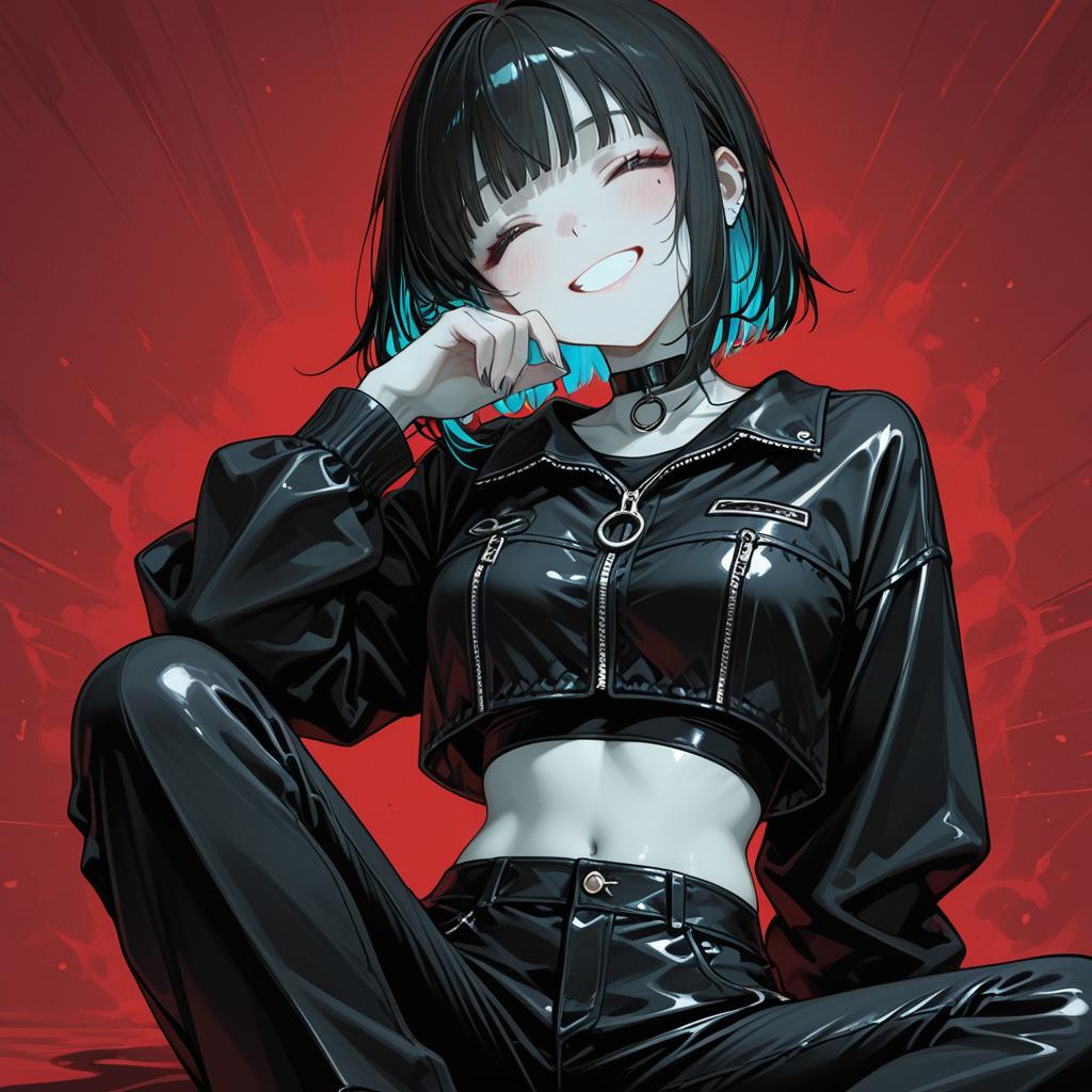 Digital illustration of a smiling anime girl with short black hair featuring blue highlights. She is wearing a shiny black cropped leather jacket and matching high-waisted leather pants. She accessorizes with a black choker featuring a ring and has black nail polish. The character is sitting with one knee up against a vibrant red background, eyes closed, and displaying a joyful grin with visible teeth.