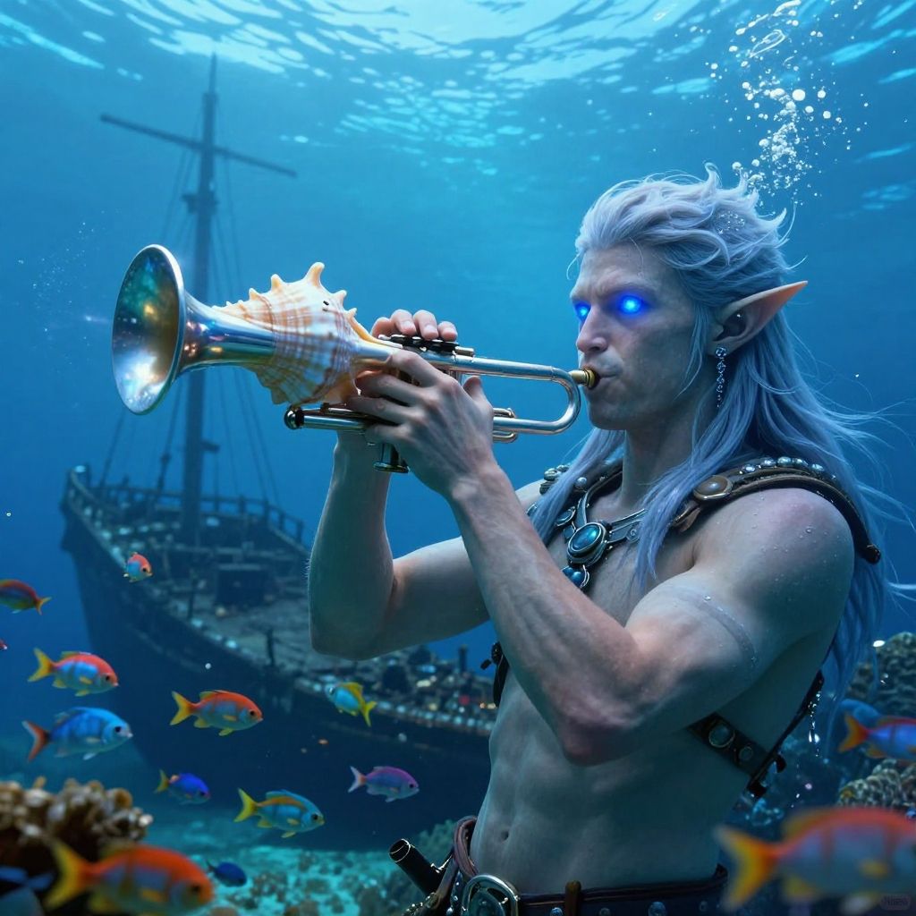 Male sea elf playing a conch shell trumpet near a sunken ship, ethereal and serene with glowing blue eyes, surrounded by schools of colorful fish, magical realism
