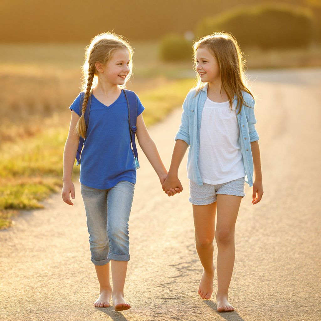 Photograph of two young girls, around 5-7 years old, with light brown wavy hair, smiling widely and hugging each other in the center. The girl on the left wears a light blue T-shirt, while the girl on the right wears a pink T-shirt. They stand in a sunlit sunflower field with vibrant yellow sunflowers in the background. The clear blue sky is visible above, and the sunflowers are slightly blurred in the foreground, creating a depth-of-field effect. The girls' joyful expressions and the bright, sunny setting convey a sense of happiness and warmth.