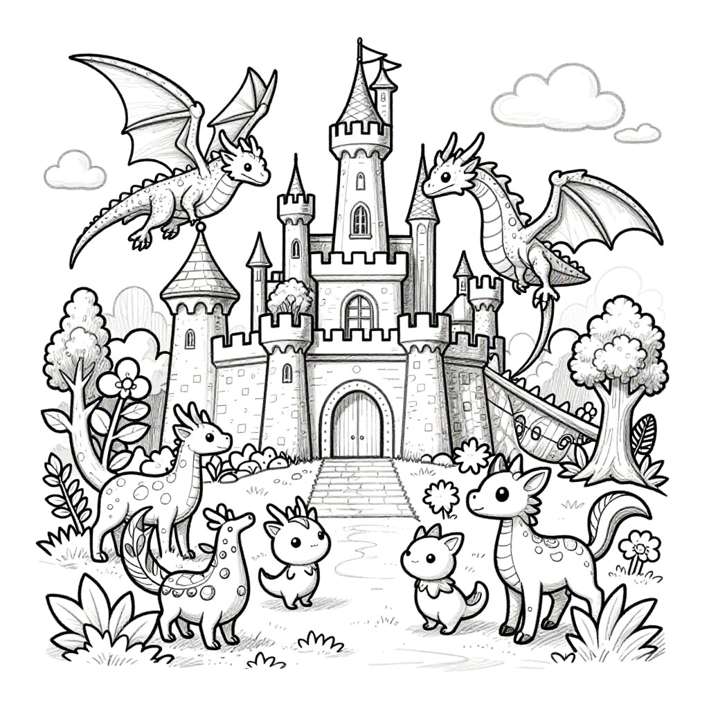 Coloring page generator free, whimsical fantasy scene including castles, dragons, and magical forest creatures in a clean pencil sketch style, ideal for kids and adults to add vibrant colors and unleash imagination