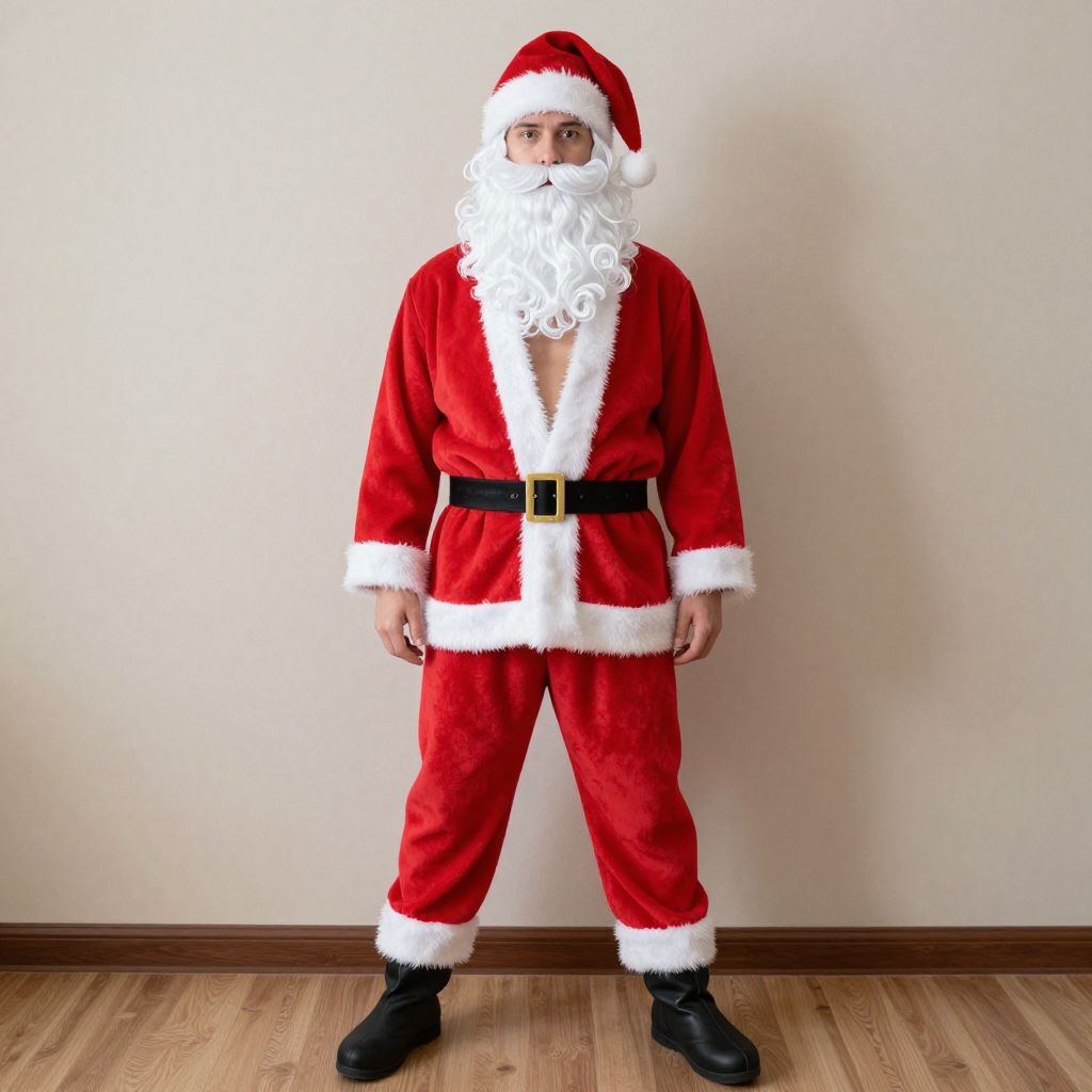 Photograph of a person standing against a plain, light-colored wall with wooden flooring. They are wearing a full Santa Claus costume, including a red velvet suit with white fur trim, black belt with gold buckle, black boots, and a red Santa hat with white fur. The individual has a large, curly white fake beard covering their face, with only their eyes visible. They are standing with arms slightly away from their body, looking directly at the camera. The costume is festive, bright, and contrasts with the neutral background.