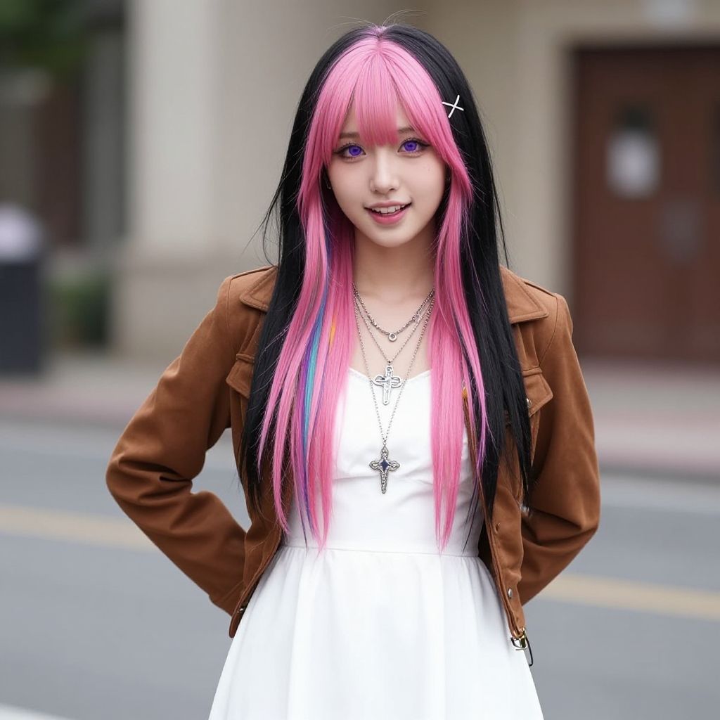 Masterpeace, best quality, highres, 1girl, solo, multicolored hair, pink hair, purple eyes, black hair, dress, colored inner hair, hair between eyes, white dress, brown jacket, two-tone hair, jewelry, long sleeves, x hair ornament, bangs, bracelet, very long hair, streaked hair, hairclip, standing, cowboy shot, smile, street, arms behind back, open mouth