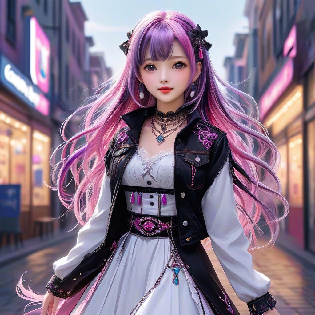This is a vibrant, digital anime-style illustration of a young woman with long, wavy purple and pink hair adorned with black hairpins. She has fair skin, large purple eyes, and wears bold red lipstick. Her outfit consists of a white, lace-trimmed dress with a black leather jacket featuring intricate pink embroidery. She accessorizes with multiple necklaces, a black choker, and dangling earrings. The background is a bustling urban street at night, illuminated by neon signs in pink and blue, casting a soft glow. The street is lined with blurred buildings, emphasizing the character's prominence in the foreground.