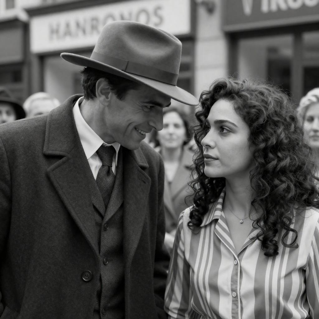 Black-and-white photograph of a man and woman in an embrace. Man in a dark hat and light coat, woman in a white dress, looking to the side. Background has blurred figures and geometric window patterns. Man's left arm around woman's waist, woman's right arm around man's neck. Intense expressions. Man's right hand holding woman's left hand. Sunlight creates shadows.