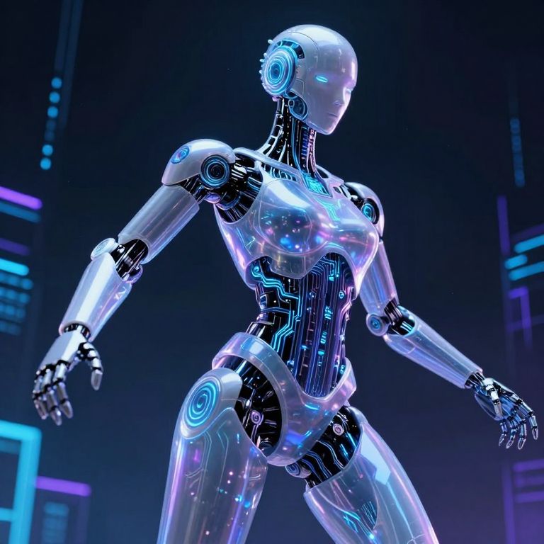 Photorealistic CGI of a futuristic female humanoid robot with a sleek, transparent metallic body, illuminated by blue and purple neon lights. The robot has a smooth, glossy finish with intricate circuitry patterns visible on her joints and chest. Her head is bald, and her eyes are glowing blue. She stands in a dynamic pose with arms slightly bent and legs apart. The background is a dark, futuristic setting with vertical neon light strips. The image emphasizes the robotic figure's sleek design and advanced technology.