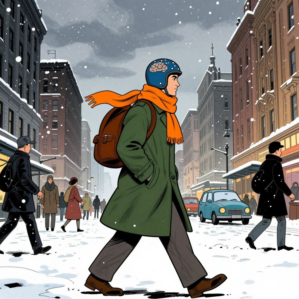 In this comic book-style illustration reminiscent of Enki Bilal's work, a man strides confidently down a snowy street, his figure framed by the urban landscape. He is clad in a green trench coat, a vibrant orange scarf wrapped around his neck, and a blue helmet adorned with white spots, suggesting a connection to his brain. The man's backpack, a rich brown color, trails behind him as he navigates the snowy street. The scene is bustling with activity, with other pedestrians and vehicles visible in the background. The buildings lining the street are tall and imposing, their facades adorned with intricate details. The sky above is a mix of dark clouds and falling snowflakes, adding a sense of depth and movement to the scene. The overall composition is dynamic, with the man's figure centrally positioned, drawing the viewer's eye through the bustling street and into the depths of the urban environment.