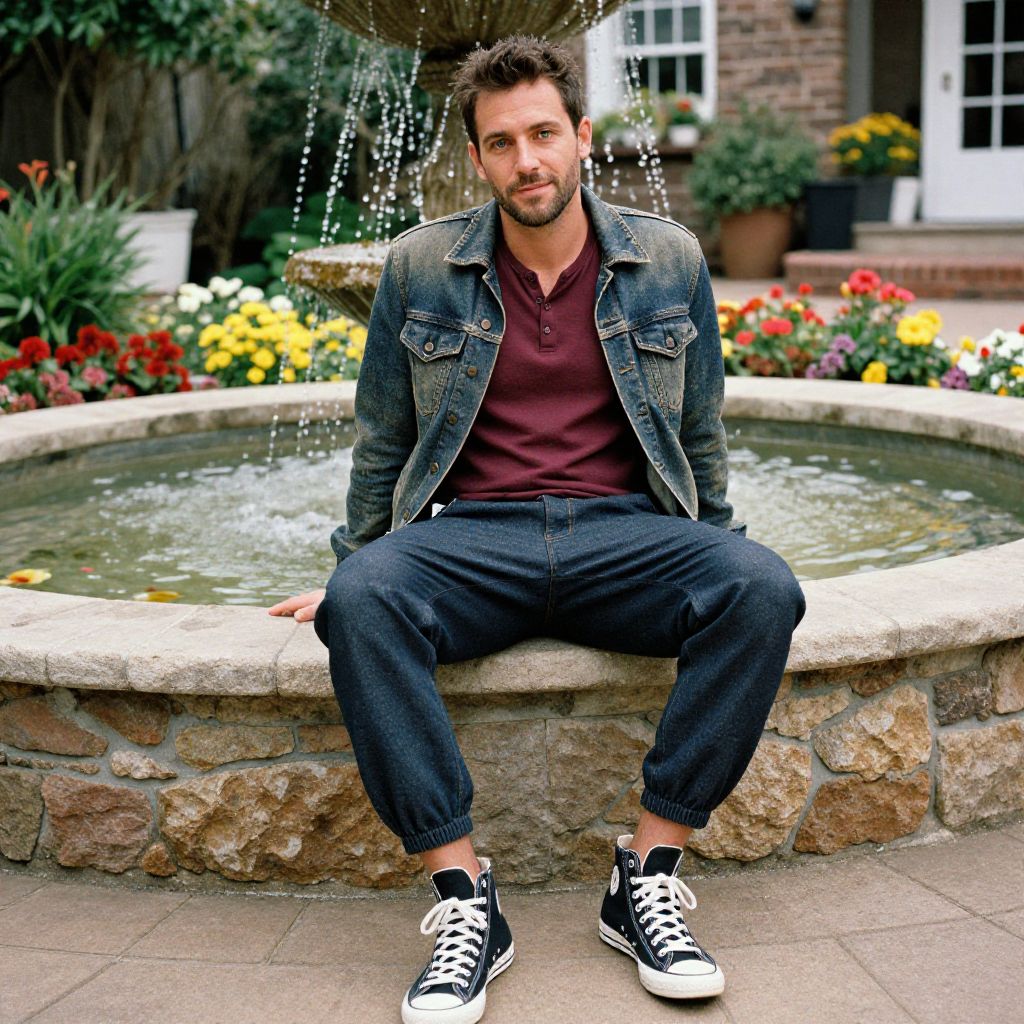 A man, burgundy henley, dark denim twill joggers, black high-top sneakers, rugged denim jacket, quaint garden courtyard, bubbling fountain, colorful flower beds, lithographic film style, relaxed smile, adventurous spirit. Man has masculine face and piercing eyes