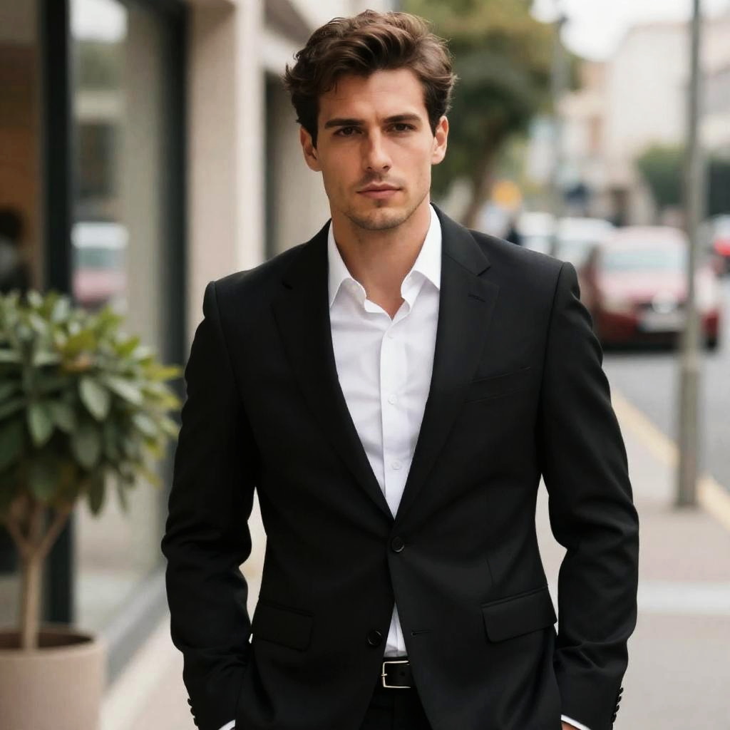 Photograph of a man and a woman in a yellow tram. The man with dark hair, light skin, and a serious expression, wears a white suit and black tie, gripping the tram's handle. The blonde woman with light skin and an intense expression, wears a white blouse and black vest, leans against him. Urban background with blurred buildings.