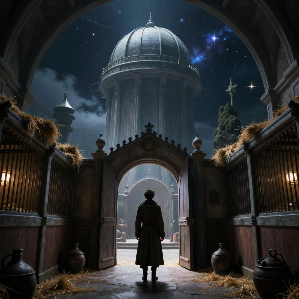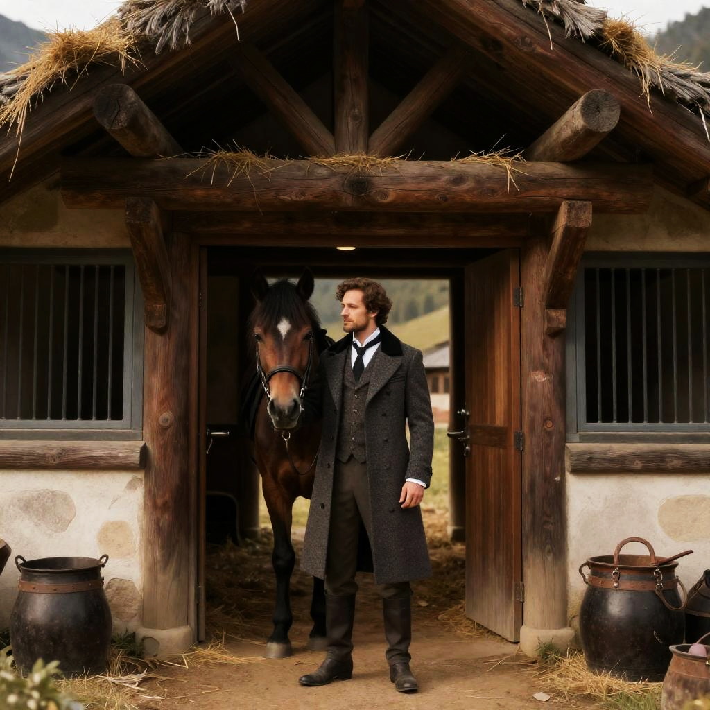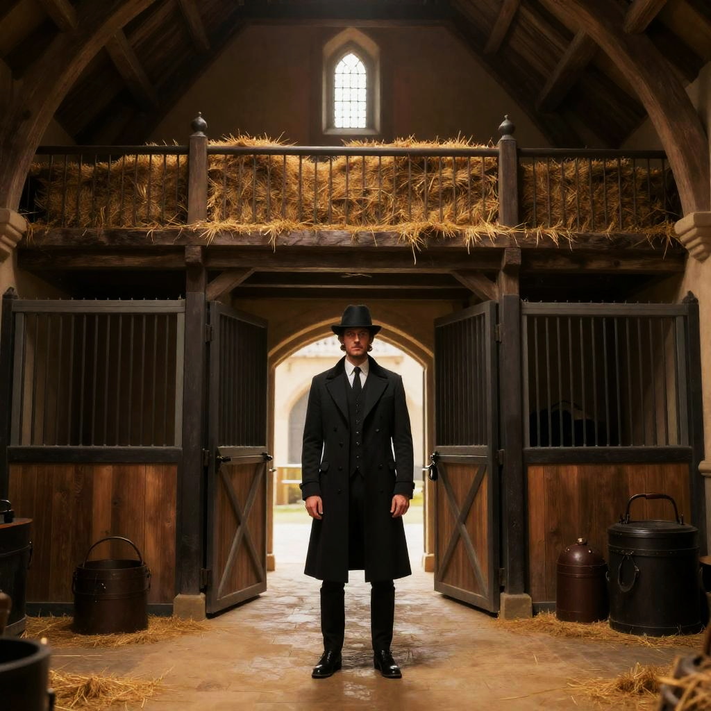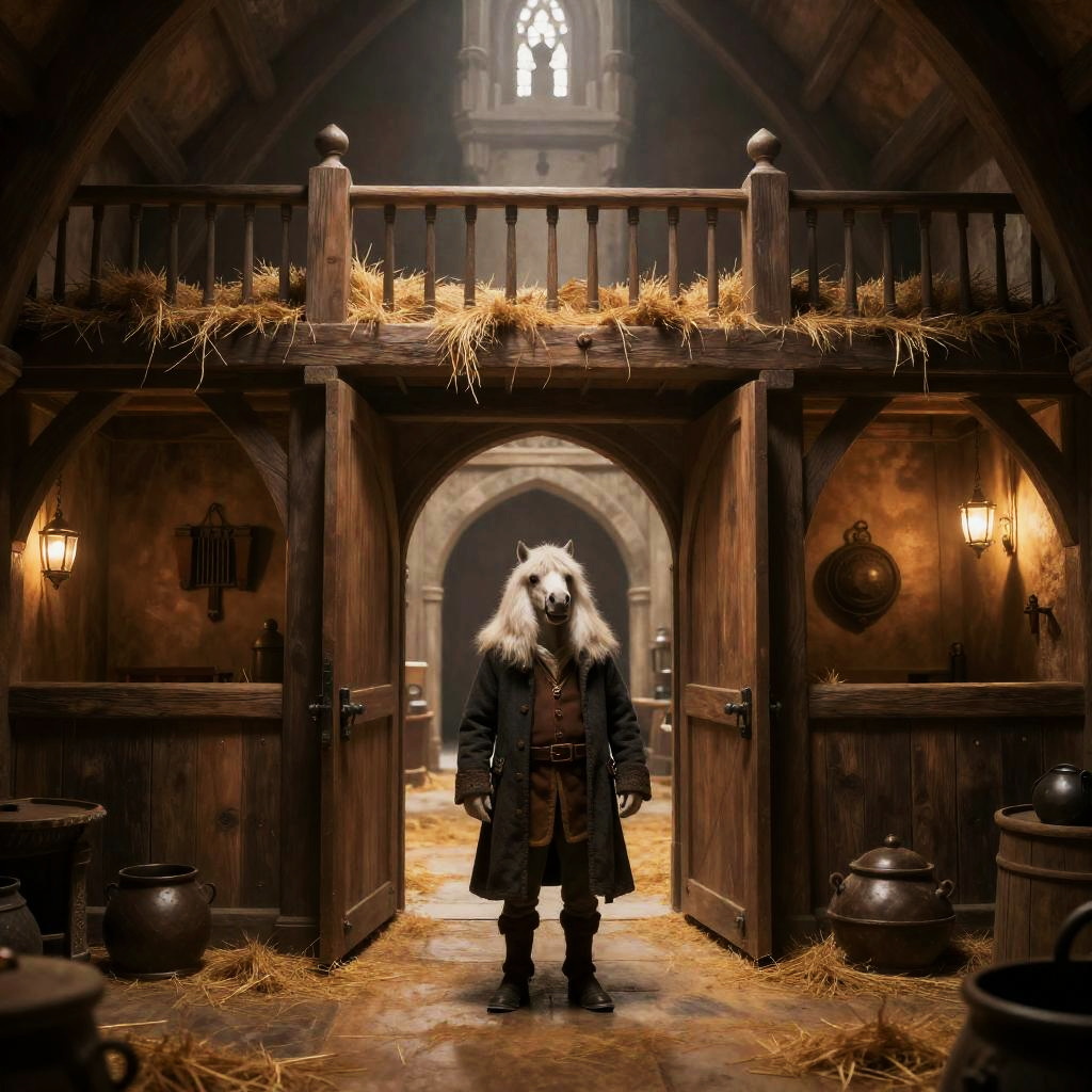 A goblin stablehand in a long coat stands at the door of a medieval stable, high rafters, hayloft, stalls and tack, high quality, detailed, fantasy style, warm tones, soft lighting, elegant, enchanting, magical atmosphere