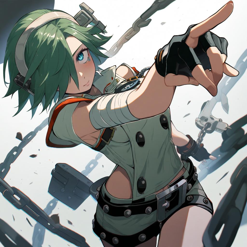 A.b.a, guilty gear, 1girl, stitched mouth, bags under eyes, green eyes, hair over one eye, short hair, red hair, long hair, green hair, bandages, fingerless gloves, object through head, key, chain, by artist yae (mono110), animagine