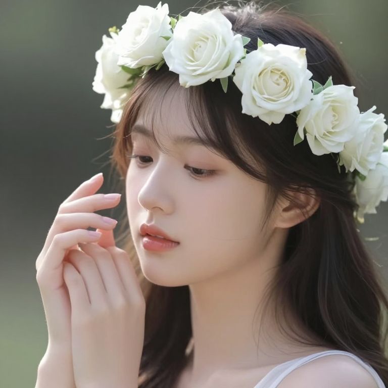 Radiant serenity blooms as delicate white roses crown her head, symbolizing purity and hope, while her gentle touch invites a moment of introspection and timeless beauty.