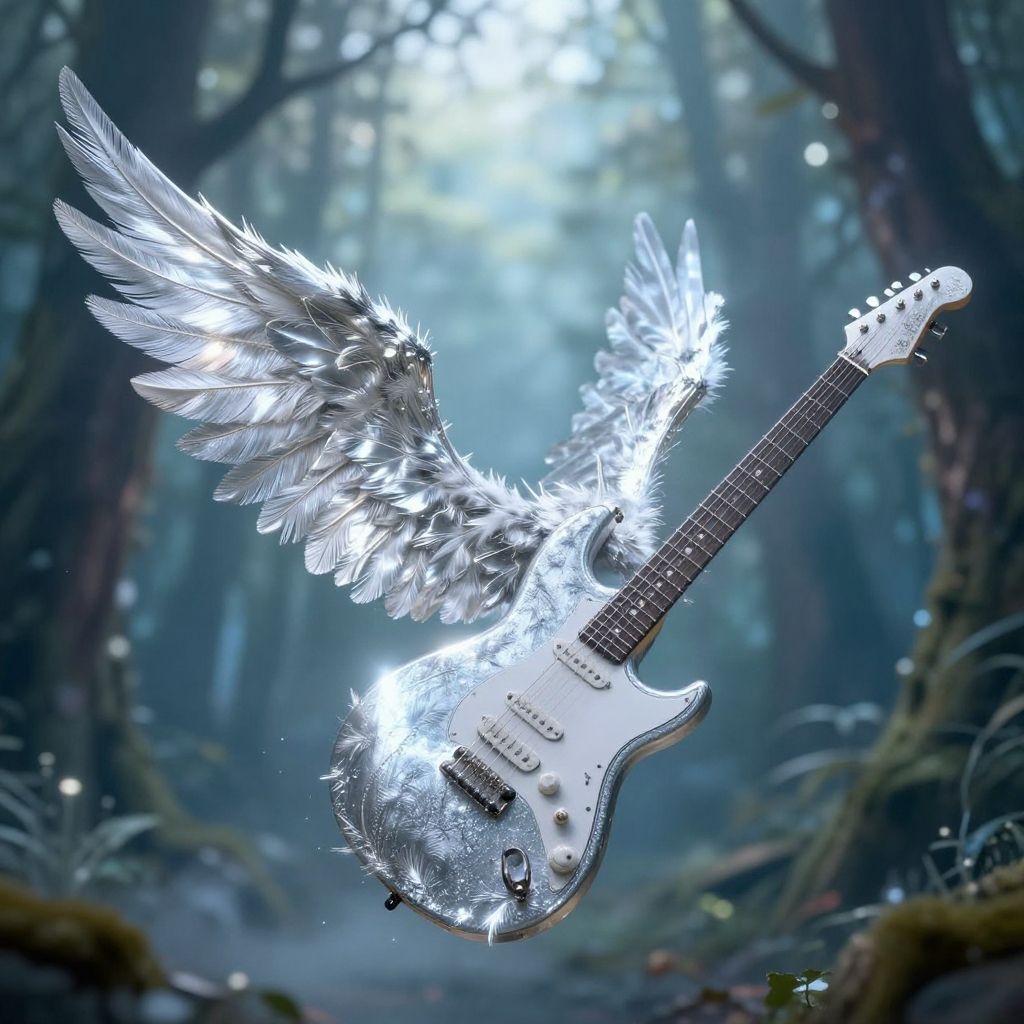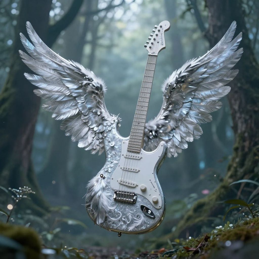 Electric guitar with wings made of shimmering silver feathers, floating above a mystical forest, ethereal atmosphere, soft glowing light, fantasy art style, intricate details