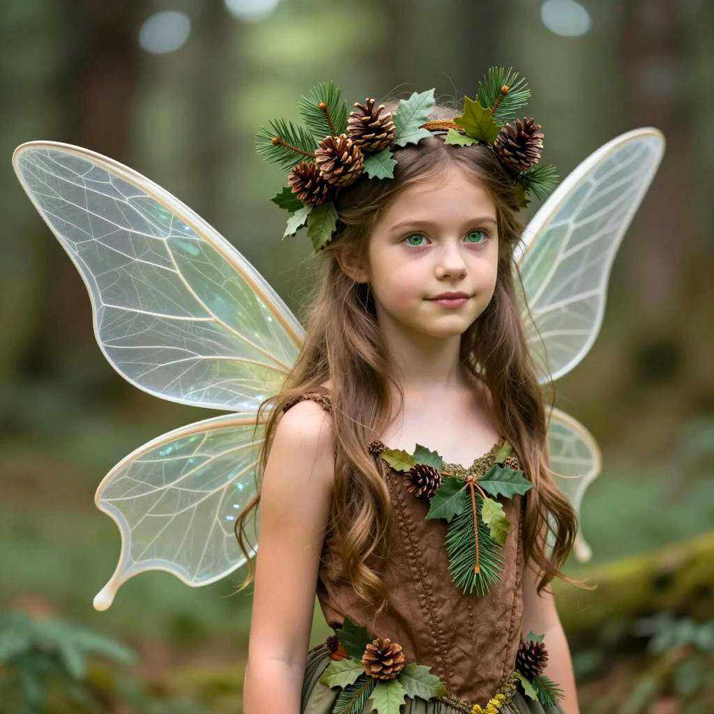 Forest fairy costume, photorealistic portrait, young girl, fairy, long brown hair, green eyes, wearing nature-inspired crown with pine cones and leaves, detailed transparent wings with vein patterns, brown medieval-style dress with leaf and pine cone decorations, soft forest background, bokeh effect, fantasy, whimsical, detailed ures, natural light, slight smile, upper body shot, serene expression, subtle makeup, realistic digital art, ethereal, delicate, fantasy character