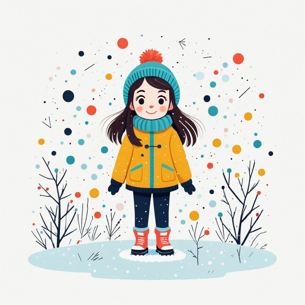 Illustration character design, cartoonish whimsical style. Girl in snow, bright colors, simple shapes, white backdrop