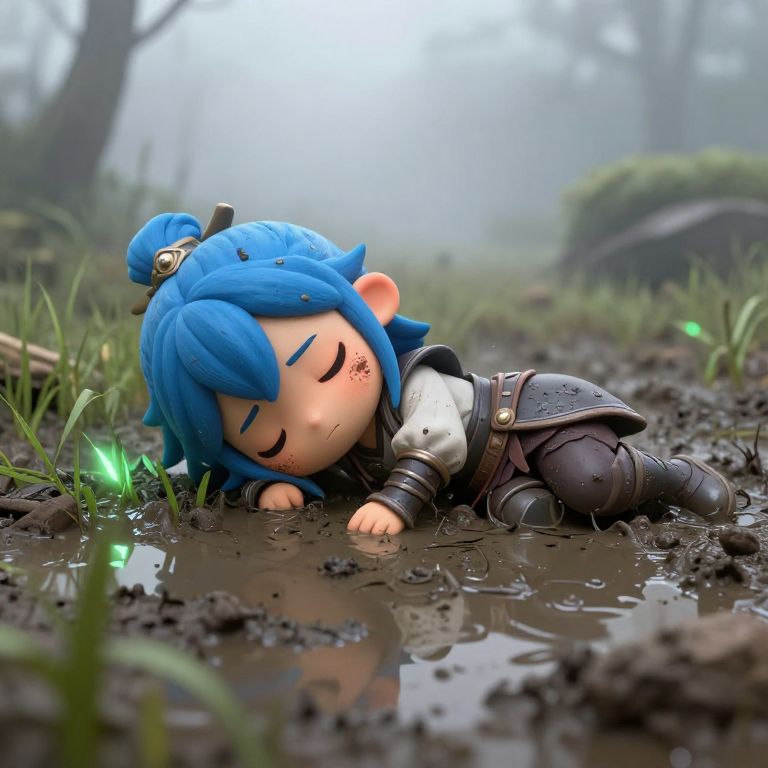 Cute warrior blue hair, sinking in mud swamp, distress, dying, lying down, glowing grass, misty atmosphere, thick fog, 3d render, extremely detailed, unreal engine, mud, dirt,