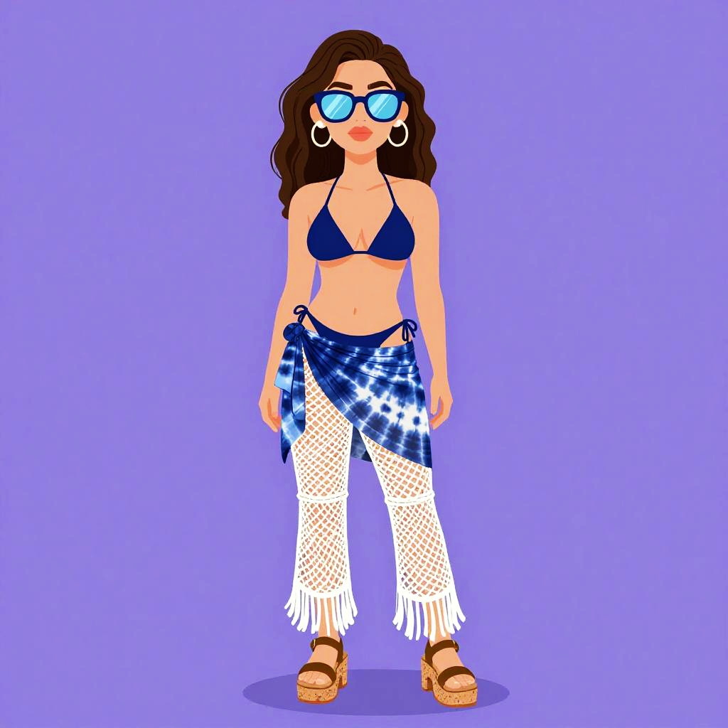 Illustration of a woman wearing a deep ocean blue triangle bikini with a halter neck and low-rise bottom, paired with a lightweight tie-dye sarong and white crochet beach pants featuring intricate fringe details. She accessorizes with oversized retro-style sunglasses with mirrored lenses and chunky cork platform sandals. The woman has long wavy brown hair and hoop earrings, set against a plain purple background.