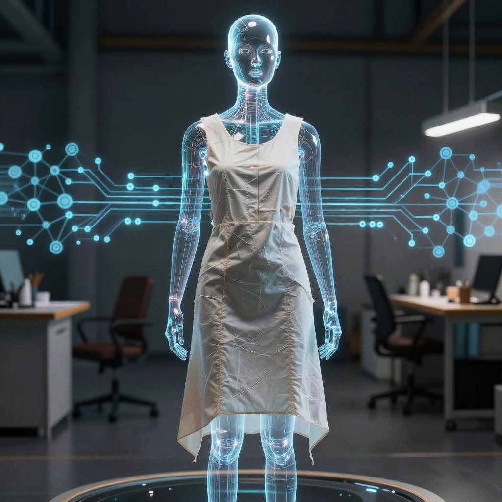 Digital artwork featuring AI cloth removal process on a holographic model in a sci-fi environment, with AI neural network patterns and glowing circuits overlay, representing futuristic AI applications in virtual fitting and custom garment creation.