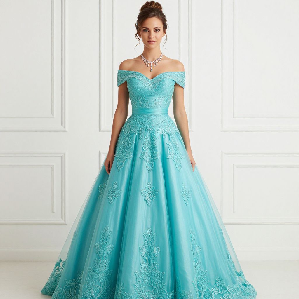 Elegant woman posing gracefully in a turquoise ball gown featuring off-the-shoulder sleeves, sweetheart neckline, and intricate lace appliqués, complemented by a sparkling necklace against a classic white panel backdrop.
