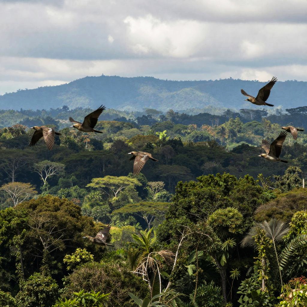 Panoramic view of birds flying above the lush Amazon rainforest with multiple layers of dense green foliage and distant mountains under cloudy sky. Sunlight filters through clouds, highlighting the tropical wilderness and vibrant wildlife.