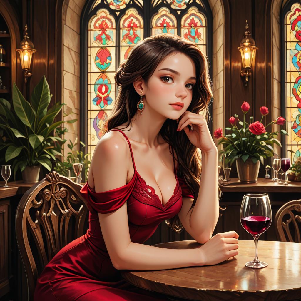 A young woman with long brown hair wearing an elegant red evening gown is seated at a wooden table inside a room with large colorful stained glass windows and warm candle light sconces. The setting resembles a historic or church-like venue with rustic brick walls. On the table next to her is a glass of white wine and a vase with bright yellow flowers. The woman is gazing slightly off camera, showcasing her makeup and delicate earrings.