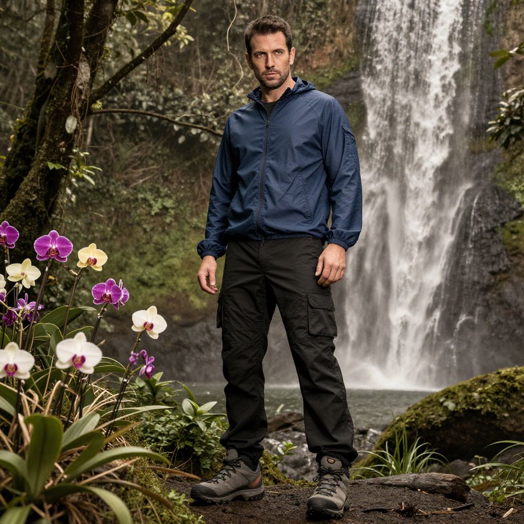 A man, navy blue windbreaker, black tactical trousers, rugged gray hiking shoes, standing in a lush tropical rainforest, vibrant orchids, cascading waterfalls, sepia effect, focused expression. Man has masculine face and piercing eyes